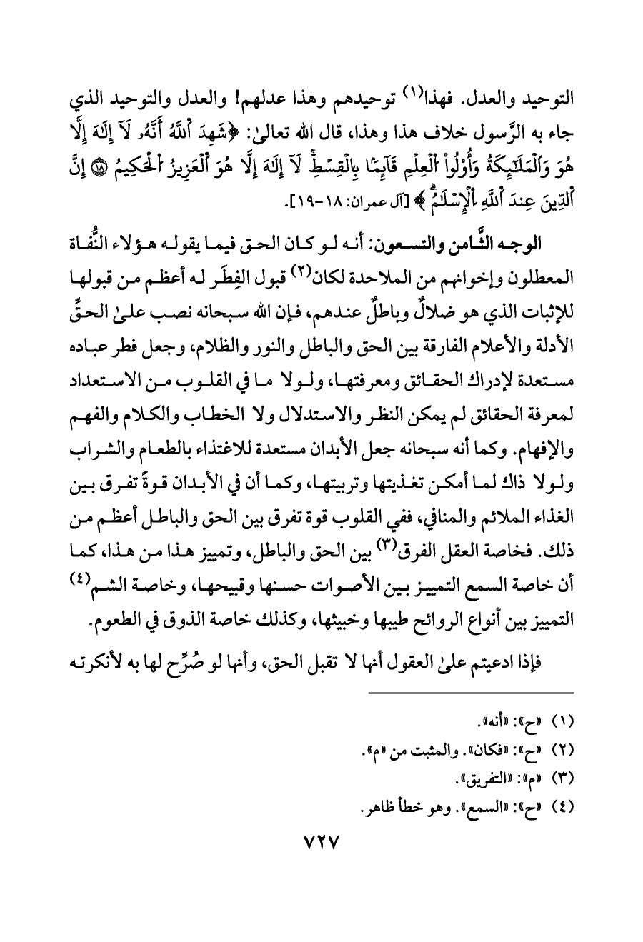 التوحيد والعدل. فهذا (¬١) توحيدهم وهذا عدلهم! والعدل والتوحيد الذي جاء به الرَّسول خلاف هذا وهذا، قال الله تعالى: {شَهِدَ اَللَّهُ أَنَّهُ لَا إِلَهَ إِلَّا هُوَ وَاَلْمَلَائِكَةُ وَأُوْلُوا اُلْعِلْمِ قَائِمًا بِالْقِسْطِ لَا إِلَهَ إِلَّا هُوَ اَلْعَزِيزُ اُلْحَكِيمُ (١٨) إِنَّ اَلدِّينَ عِندَ اَللَّهِ اِلْإِسْلَامُ} [آل عمران: ١٨ - ١٩].