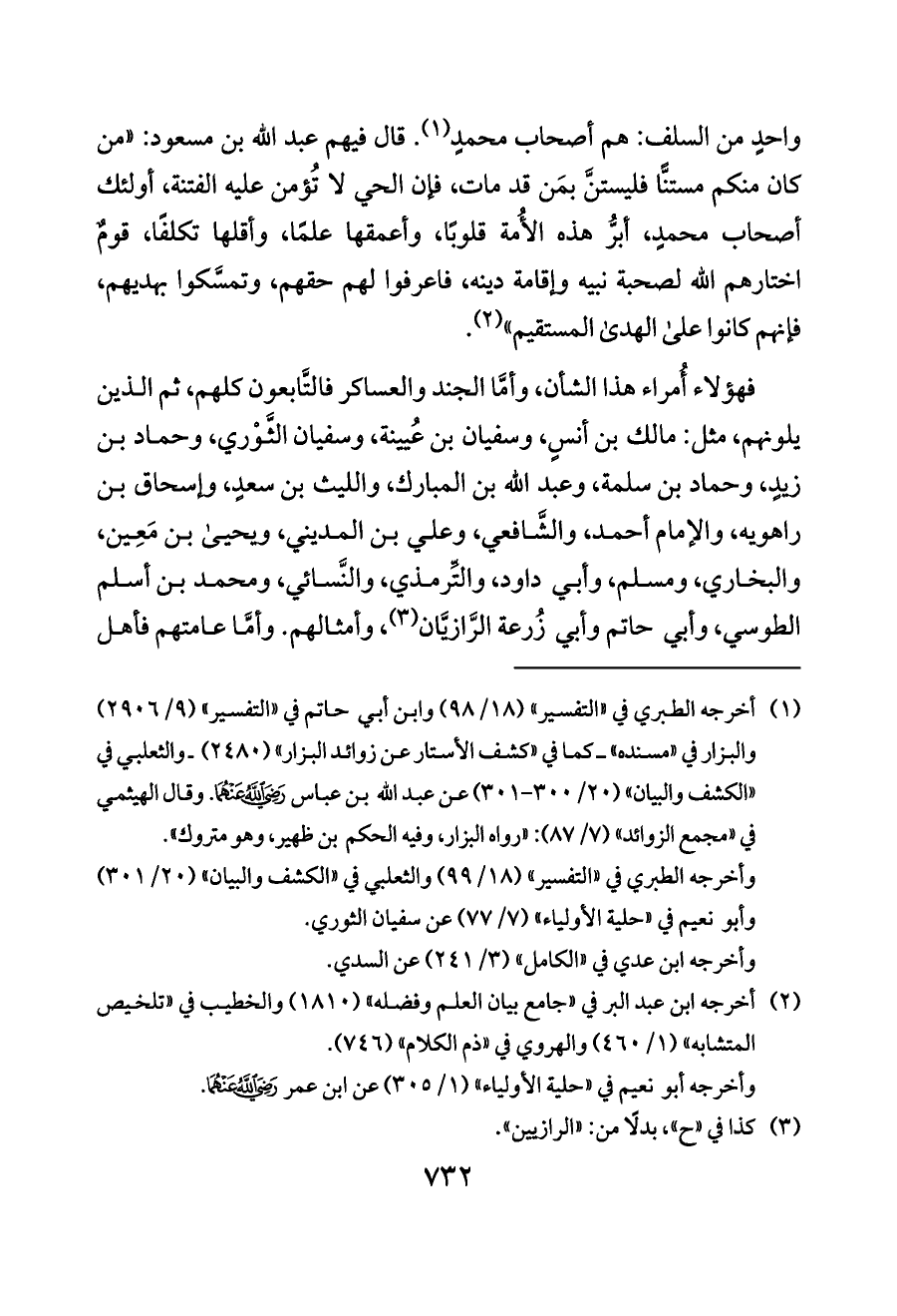 من السلف: هم أصحاب محمدٍ (¬١). قال فيهم عبد الله بن مسعود: «من كان منكم مستنًّا فليستنَّ بمَن قد مات، فإن الحي لا تُؤمن عليه الفتنة، أولئك أصحاب محمدٍ، أبرُّ هذه الأُمة قلوبًا، وأعمقها علمًا، وأقلها تكلفًا، قومٌ اختارهم الله لصحبة نبيه وإقامة دينه، فاعرفوا لهم حقهم، وتمسَّكوا بهديهم، فإنهم كانوا على الهدى المستقيم» (¬٢).