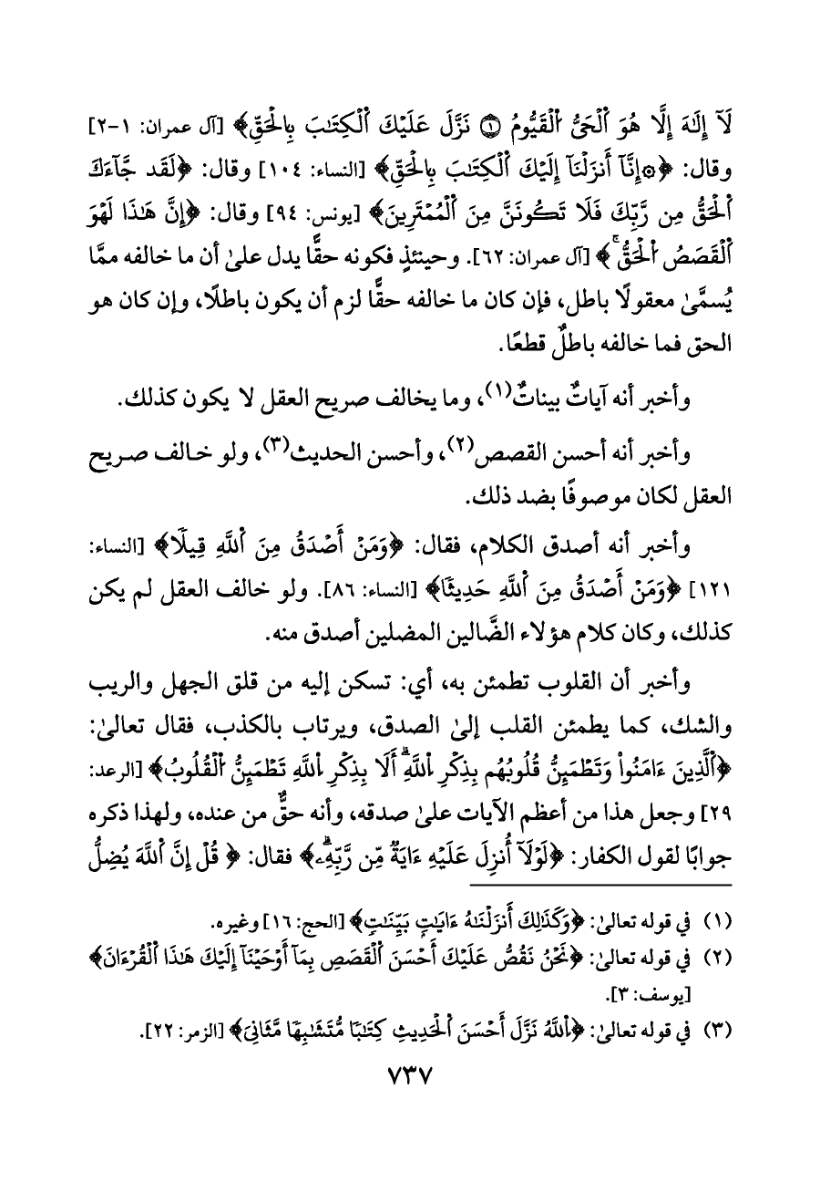 لَا إِلَهَ إِلَّا هُوَ اَلْحَيُّ اُلْقَيُّومُ (١) نَزَّلَ عَلَيْكَ اَلْكِتَابَ بِالْحَقِّ} [آل عمران: ١ - ٢] وقال: {* إِنَّا أَنزَلْنَا إِلَيْكَ اَلْكِتَابَ بِالْحَقِّ} [النساء: ١٠٤] وقال: {لَقَد جَّاءَكَ اَلْحَقُّ مِن رَّبِّكَ فَلَا تَكُونَنَّ مِنَ اَلْمُمْتَرِينَ} [يونس: ٩٤] وقال: {إِنَّ هَذَا لَهْوَ اَلْقَصَصُ اُلْحَقُّ} [آل عمران: ٦٢]. وحينئذٍ فكونه حقًّا يدل على أن ما خالفه ممَّا يُسمَّى معقولًا باطل، فإن كان ما خالفه حقًّا لزم أن يكون باطلًا، وإن كان هو الحق فما خالفه باطلٌ قطعًا.