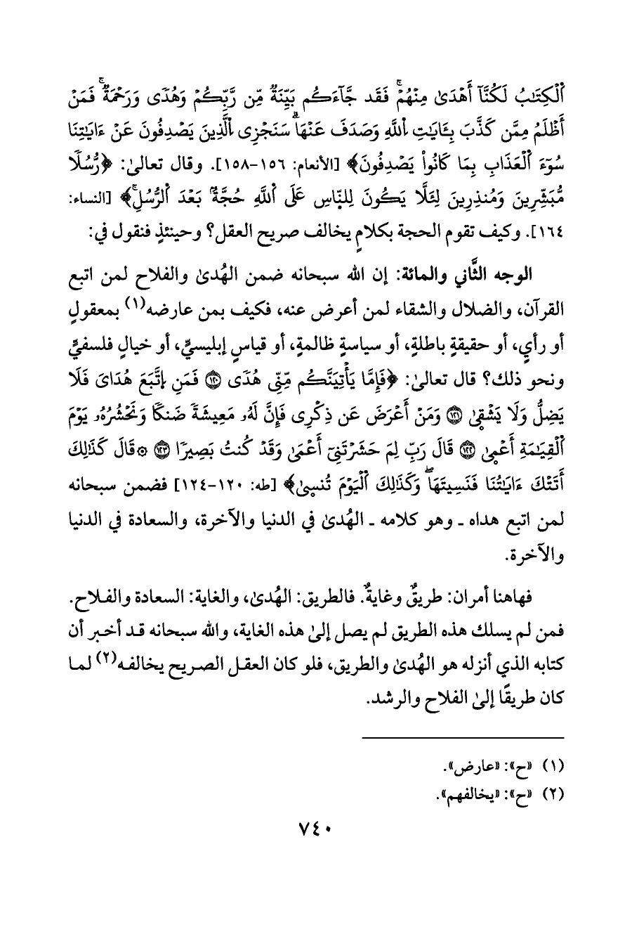 اَلْكِتَابُ لَكُنَّا أَهْدَى مِنْهُمْ فَقَد جَّاءَكُم بَيِّنَةٌ مِّن رَّبِّكُمْ وَهُدًى وَرَحْمَةٌ فَمَنْ أَظْلَمُ مِمَّن كَذَّبَ بِآيَاتِ اِللَّهِ وَصَدَفَ عَنْهَا سَنَجْزِي اِلَّذِينَ يَصْدِفُونَ عَنْ آيَاتِنَا سُوءَ اَلْعَذَابِ بِمَا كَانُوا يَصْدِفُونَ} [الأنعام: ١٥٦ - ١٥٨]. وقال تعالى: {رُّسُلًا مُّبَشِّرِينَ وَمُنذِرِينَ لِئَلَّا يَكُونَ لِلنّاسِ عَلَى اَللَّهِ حُجَّةٌ بَعْدَ اَلرُّسُلِ} [النساء: ١٦٤]. وكيف تقوم الحجة بكلامٍ يخالف صريح العقل؟ وحينئذٍ فنقول في: