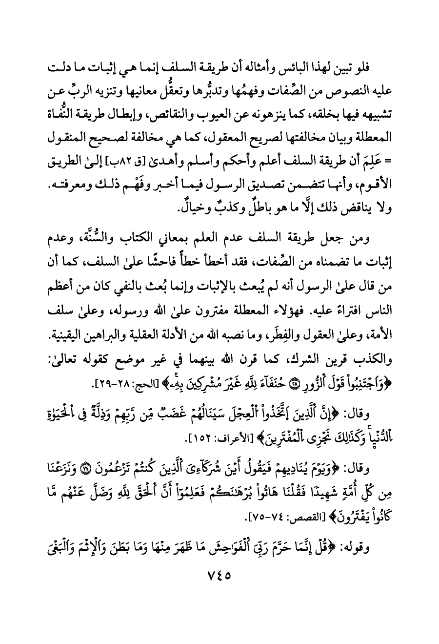 ومن جعل طريقة السلف عدم العلم بمعاني الكتاب والسُّنَّة، وعدم إثبات ما تضمناه من الصِّفات، فقد أخطأ خطأً فاحشًا على السلف، كما أن من قال على الرسول أنه لم يُبعث بالإثبات وإنما بُعث بالنفي كان من أعظم الناس افتراءً عليه. فهؤلاء المعطلة مفترون على الله ورسوله، وعلى سلف الأمة، وعلى العقول والفِطَر، وما نصبه الله من الأدلة العقلية والبراهين اليقينية. والكذب قرين الشرك، كما قرن الله بينهما في غير موضع كقوله تعالى: {وَاَجْتَنِبُوا قَوْلَ اَلزُّورِ (٢٨) حُنَفَاءَ لِلَّهِ غَيْرَ مُشْرِكِينَ بِهِ} [الحج: ٢٨ - ٢٩].