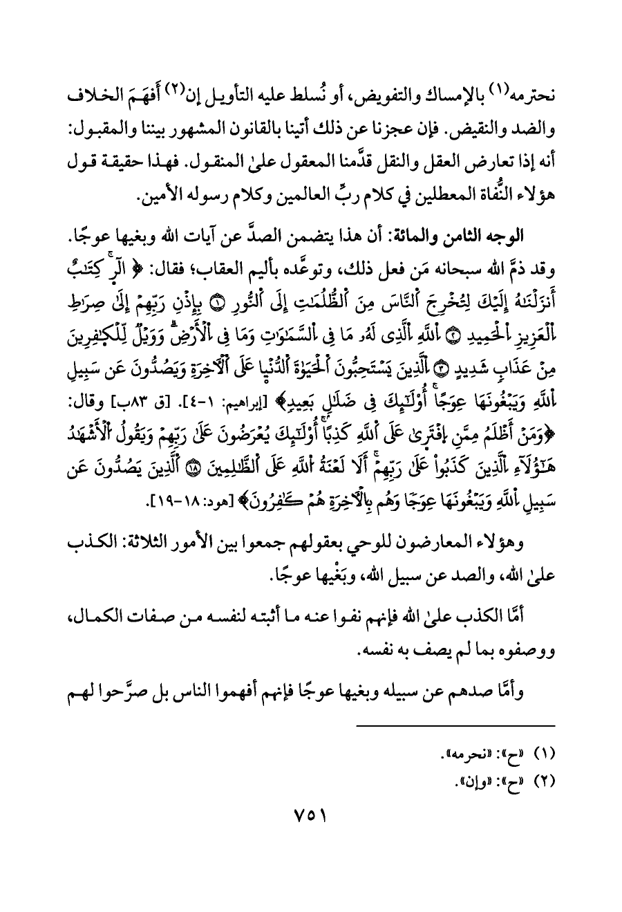 الوجه الثامن والمائة: أن هذا يتضمن الصدَّ عن آيات الله وبغيها عوجًا. وقد ذمَّ الله سبحانه مَن فعل ذلك، وتوعَّده بأليم العقاب؛ فقال: {الر كِتَابٌ أَنزَلْنَاهُ إِلَيْكَ لِتُخْرِجَ اَلنَّاسَ مِنَ اَلظُّلُمَاتِ إِلَى اَلنُّورِ (١) بِإِذْنِ رَبِّهِمْ إِلَى صِرَاطِ اِلْعَزِيزِ اِلْحَمِيدِ (٢) اِللَّهِ اِلَّذِي لَهُ مَا فِي اِلسَّمَاوَاتِ وَمَا فِي اِلْأَرْضِ وَوَيْلٌ لِّلْكافِرِينَ مِنْ عَذَابٍ شَدِيدٍ (٣) اِلَّذِينَ يَسْتَحِبُّونَ اَلْحَيَاةَ اَلدُّنْيا عَلَى اَلْآخِرَةِ وَيَصُدُّونَ عَن سَبِيلِ اِللَّهِ وَيَبْغُونَهَا عِوَجًا أُوْلَئِكَ فِي ضَلَالٍ بَعِيدٍ} [إبراهيم: ١ - ٤]. [ق ٨٣ ب] وقال: {وَمَنْ أَظْلَمُ مِمَّنِ اِفْتَرى عَلَى اَللَّهِ كَذِبًا أُوْلَئِكَ يُعْرَضُونَ عَلَى رَبِّهِمْ وَيَقُولُ اُلْأَشْهَادُ هَؤُلَاءِ اِلَّذِينَ كَذَبُوا عَلَى رَبِّهِمْ أَلَا لَعْنَةُ اُللَّهِ عَلَى اَلظَّالِمِينَ (١٨) اَلَّذِينَ يَصُدُّونَ عَن سَبِيلِ اِللَّهِ وَيَبْغُونَهَا عِوَجًا وَهُم بِالْآخِرَةِ هُمْ كَافِرُونَ} [هود: ١٨ - ١٩].