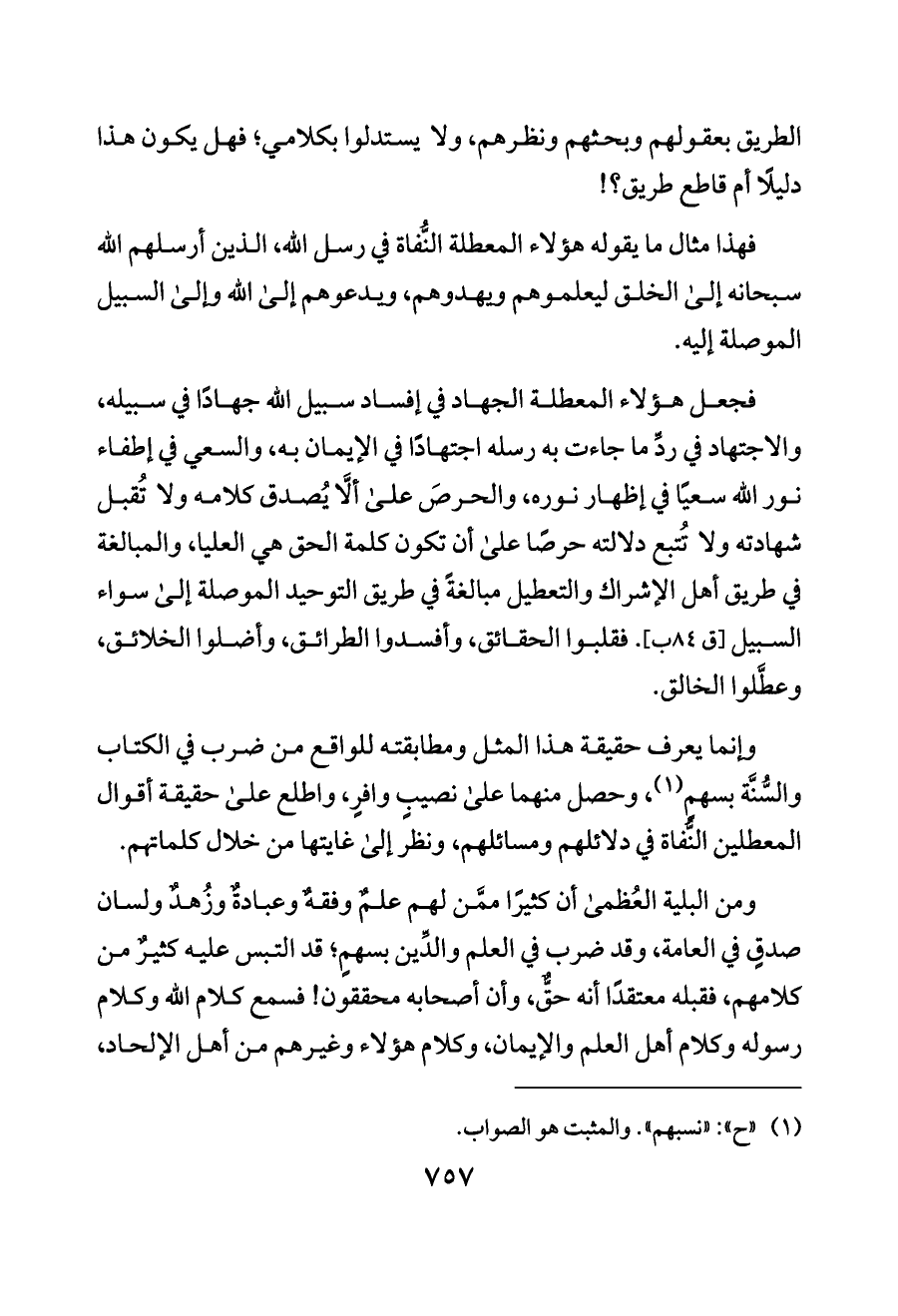 فجعل هؤلاء المعطلة الجهاد في إفساد سبيل الله جهادًا في سبيله، والاجتهاد في ردِّ ما جاءت به رسله اجتهادًا في الإيمان به، والسعي في إطفاء نور الله سعيًا في إظهار نوره، والحرصَ على ألَّا يُصدق كلامه ولا تُقبل شهادته ولا تُتبع دلالته حرصًا على أن تكون كلمة الحق هي العليا، والمبالغة في طريق أهل الإشراك والتعطيل مبالغةً في طريق التوحيد الموصلة إلى سواء السبيل [ق ٨٤ ب]. فقلبوا الحقائق، وأفسدوا الطرائق، وأضلوا الخلائق، وعطَّلوا الخالق.