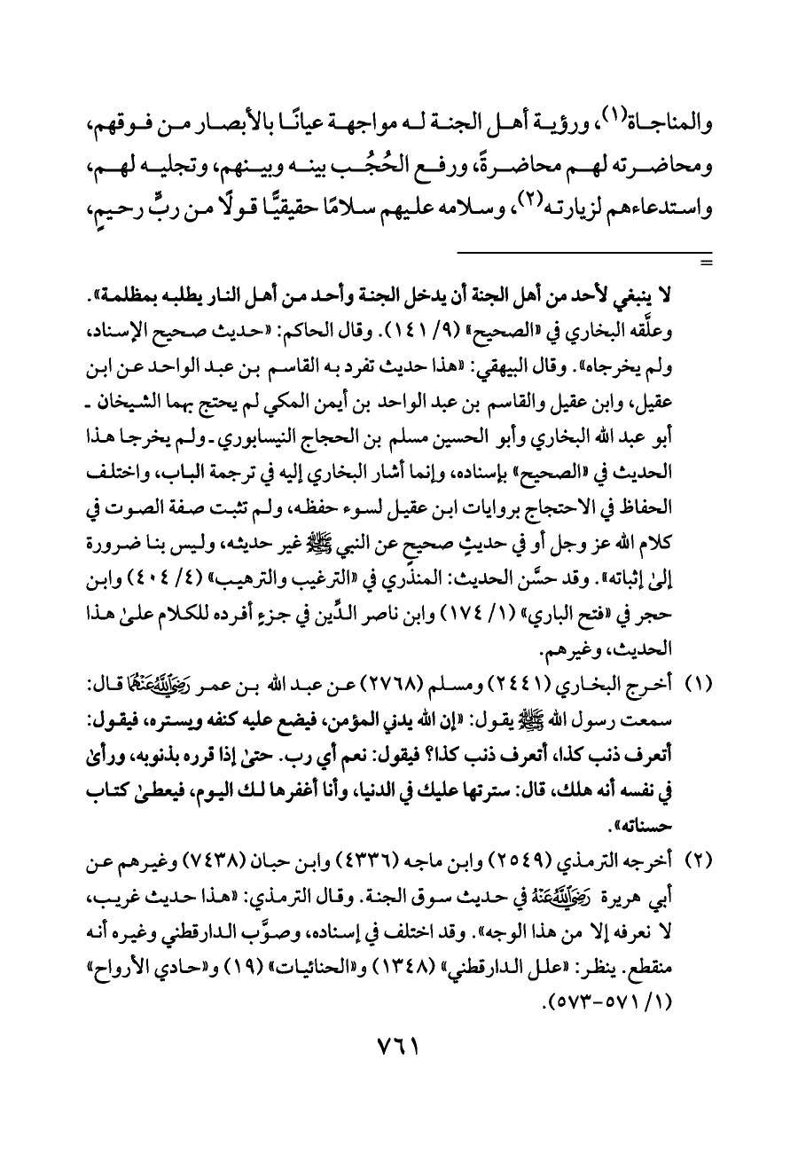 (¬٢) أخرجه الترمذي (٢٥٤٩) وابن ماجه (٤٣٣٦) وابن حبان (٧٤٣٨) وغيرهم عن أبي هريرة - رضي الله عنه - في حديث سوق الجنة. وقال الترمذي: «هذا حديث غريب، لا نعرفه إلا من هذا الوجه». وقد اختلف في إسناده، وصوَّب الدارقطني وغيره أنه منقطع. ينظر: «علل الدارقطني» (١٣٤٨) و «الحنائيات» (١٩) و «حادي الأرواح» (١/ ٥٧١ - ٥٧٣).