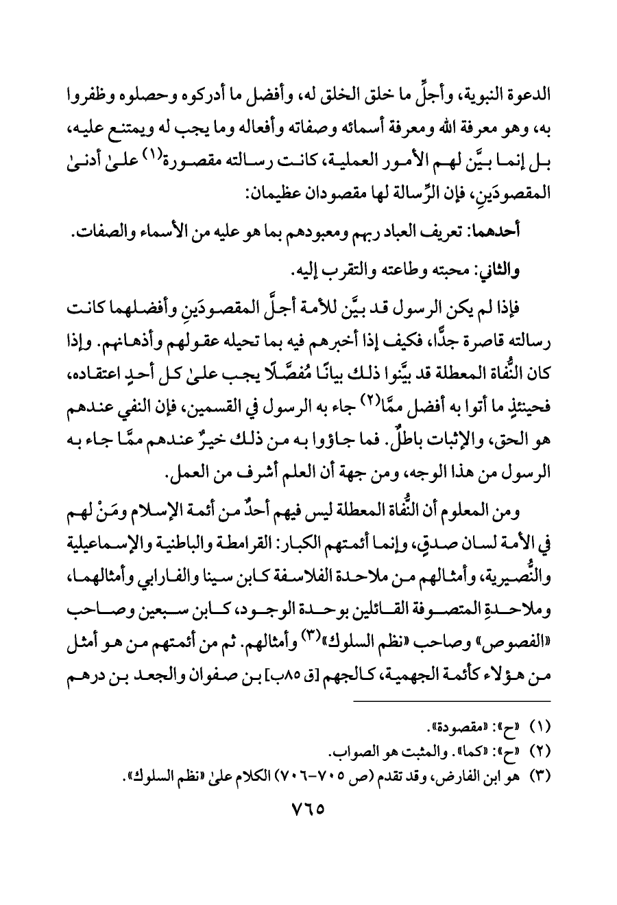 فإذا لم يكن الرسول قد بيَّن للأمة أجلَّ المقصودَينِ وأفضلهما كانت رسالته قاصرة جدًّا، فكيف إذا أخبرهم فيه بما تحيله عقولهم وأذهانهم. وإذا كان النُّفاة المعطلة قد بيَّنوا ذلك بيانًا مُفصَّلًا يجب على كل أحدٍ اعتقاده، فحينئذٍ ما أتوا به أفضل ممَّا (¬٢) جاء به الرسول في القسمين، فإن النفي عندهم هو الحق، والإثبات باطلٌ. فما جاؤوا به من ذلك خيرٌ عندهم ممَّا جاء به الرسول من هذا الوجه، ومن جهة أن العلم أشرف من العمل.
