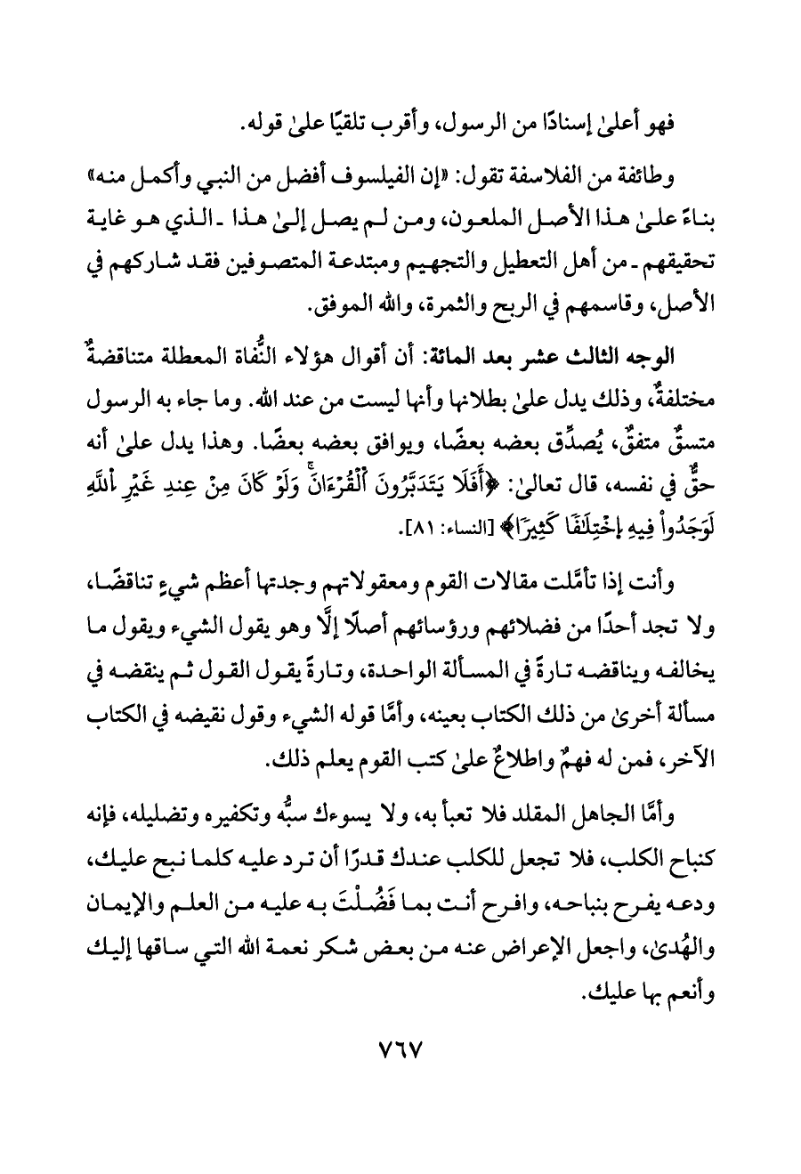وأنت إذا تأمَّلت مقالات القوم ومعقولاتهم وجدتها أعظم شيءٍ تناقضًا، ولا تجد أحدًا من فضلائهم ورؤسائهم أصلًا إلَّا وهو يقول الشيء ويقول ما يخالفه ويناقضه تارةً في المسألة الواحدة، وتارةً يقول القول ثم ينقضه في مسألة أخرى من ذلك الكتاب بعينه، وأمَّا قوله الشيء وقول نقيضه في الكتاب الآخر، فمن له فهمٌ واطلاعٌ على كتب القوم يعلم ذلك.