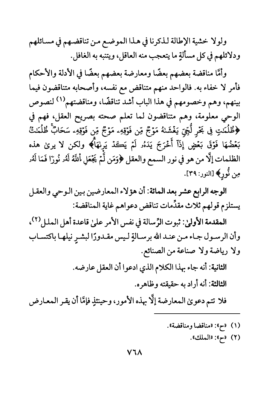 المقدمة الأولى: ثبوت الرِّسالة في نفس الأمر على قاعدة أهل الملل (¬٢)، وأن الرسول جاء من عند الله برسالةٍ ليس مقدورًا لبشرٍ نيلها باكتساب ولا رياضة ولا صناعة من الصنائع.