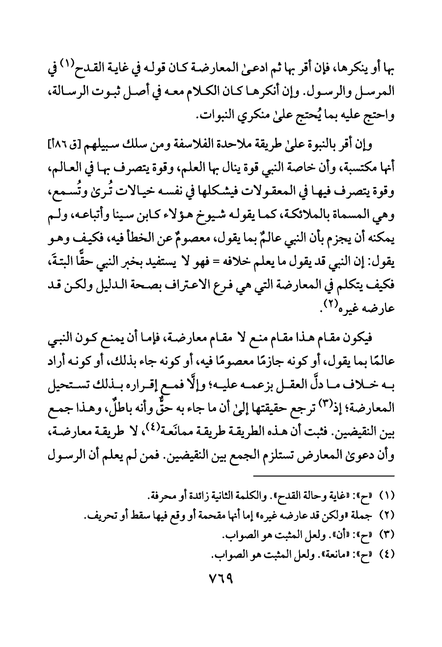 وإن أقر بالنبوة على طريقة ملاحدة الفلاسفة ومن سلك سبيلهم [ق ٨٦ أ] أنها مكتسبة، وأن خاصة النبي قوة ينال بها العلم، وقوة يتصرف بها في العالم، وقوة يتصرف فيها في المعقولات فيشكلها في نفسه خيالات تُرى وتُسمع، وهي المسماة بالملائكة، كما يقوله شيوخ هؤلاء كابن سينا وأتباعه، ولم يمكنه أن يجزم بأن النبي عالمٌ بما يقول، معصومٌ عن الخطأ فيه، فكيف وهو يقول: إن النبي قد يقول ما يعلم خلافه = فهو لا يستفيد بخبر النبي حقًّا البتةَ، فكيف يتكلم في المعارضة التي هي فرع الاعتراف بصحة الدليل ولكن قد عارضه غيره (¬٢).
