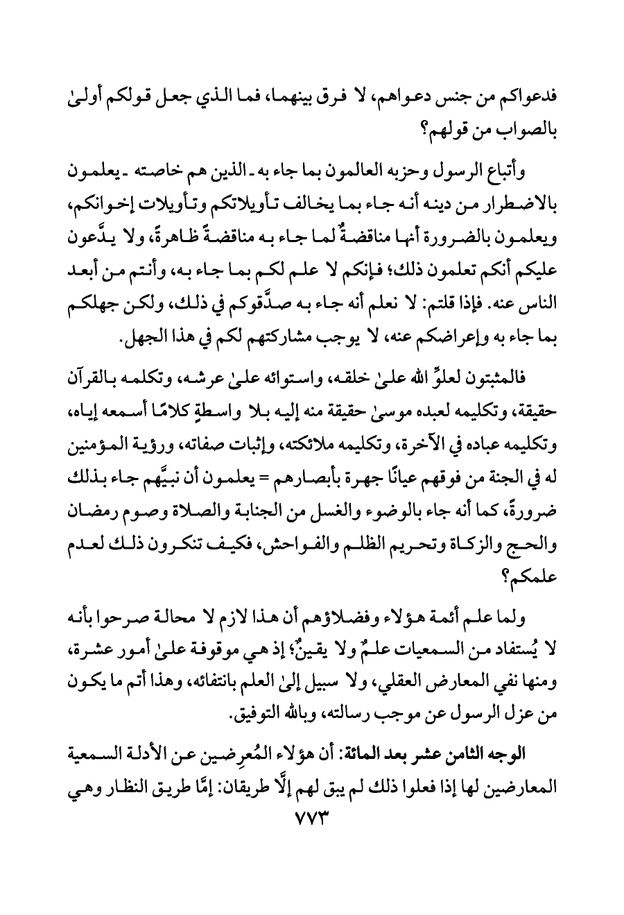 فالمثبتون لعلوِّ الله على خلقه، واستوائه على عرشه، وتكلمه بالقرآن حقيقة، وتكليمه لعبده موسى حقيقة منه إليه بلا واسطةٍ كلامًا أسمعه إياه، وتكليمه عباده في الآخرة، وتكليمه ملائكته، وإثبات صفاته، ورؤية المؤمنين له في الجنة من فوقهم عيانًا جهرة بأبصارهم = يعلمون أن نبيَّهم جاء بذلك ضرورةً، كما أنه جاء بالوضوء والغسل من الجنابة والصلاة وصوم رمضان والحج والزكاة وتحريم الظلم والفواحش، فكيف تنكرون ذلك لعدم علمكم؟