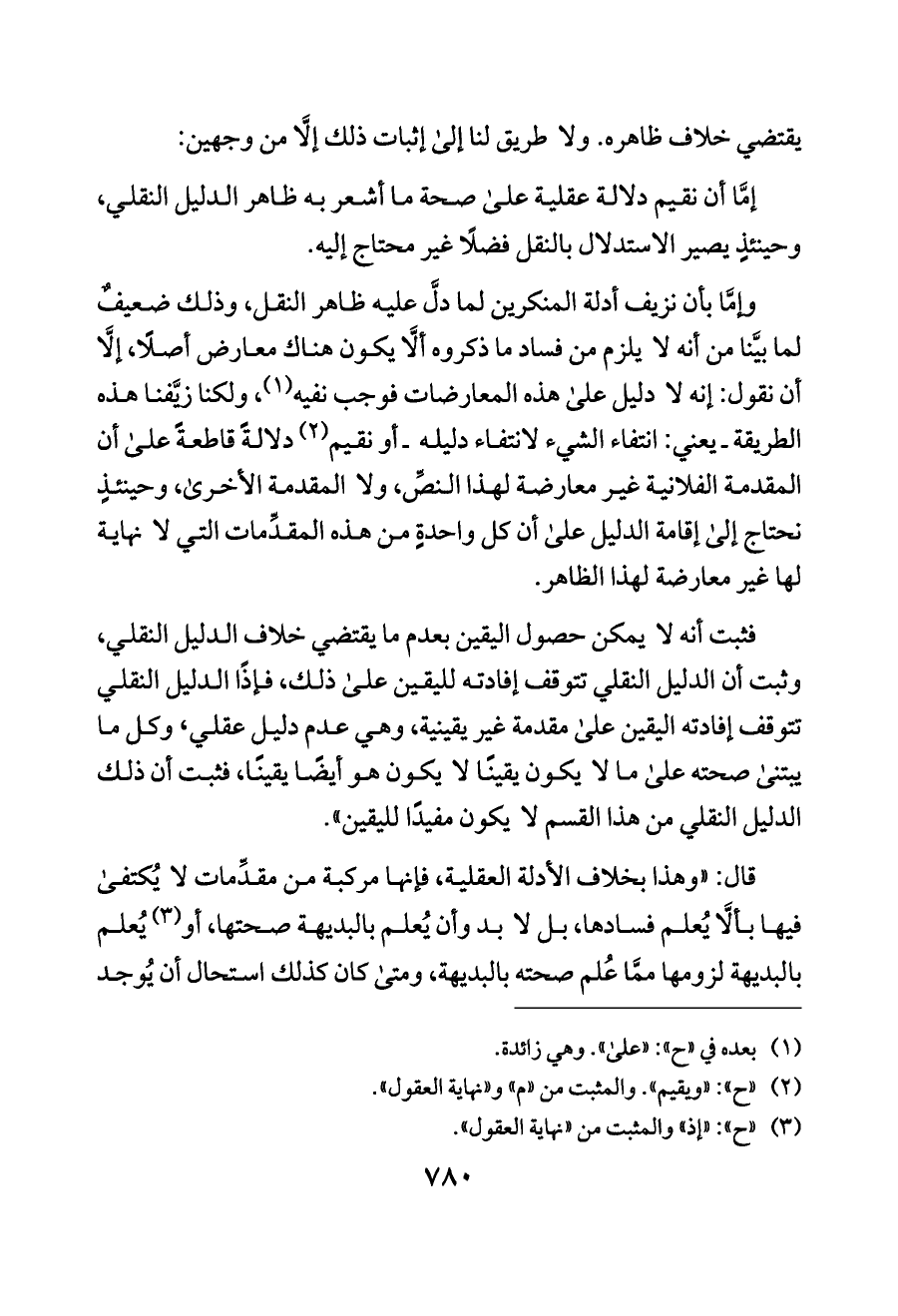 فثبت أنه لا يمكن حصول اليقين بعدم ما يقتضي خلاف الدليل النقلي، وثبت أن الدليل النقلي تتوقف إفادته لليقين على ذلك، فإذًا الدليل النقلي تتوقف إفادته اليقين على مقدمة غير يقينية، وهي عدم دليل عقلي، وكل ما يبتنى صحته على ما لا يكون يقينًا لا يكون هو أيضًا يقينًا، فثبت أن ذلك الدليل النقلي من هذا القسم لا يكون مفيدًا لليقين».