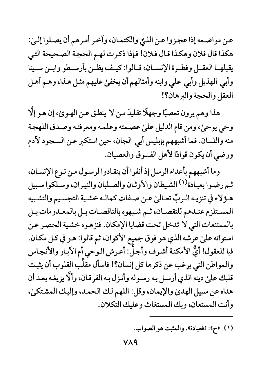 هذا وهم يرون تعصبًا وجهلًا تقليدَ من لا ينطق عن الهوى، إن هو إلَّا وحي يوحى، ومن قام الدليل على عصمته وعلمه ومعرفته وصدق اللهجة منه واللسان. فما أشبههم بإبليس أبي الجان، حين استكبر عن السجود لآدم ورضي أن يكون قوادًا لأهل الفسوق والعصيان.