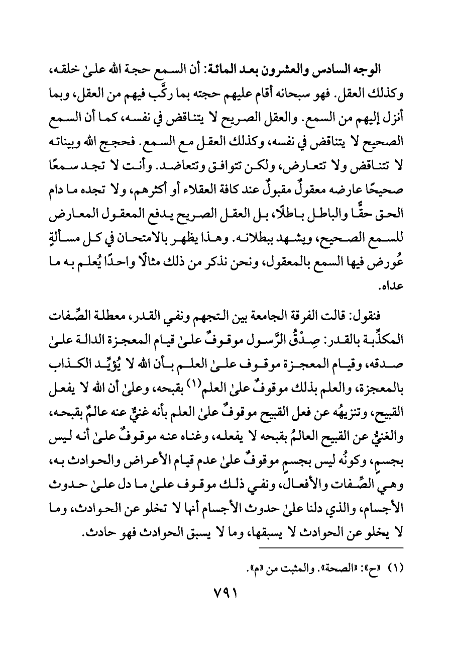 الوجه السادس والعشرون بعد المائة: أن السمع حجة الله على خلقه، وكذلك العقل. فهو سبحانه أقام عليهم حجته بما ركَّب فيهم من العقل، وبما أنزل إليهم من السمع. والعقل الصريح لا يتناقض في نفسه، كما أن السمع الصحيح لا يتناقض في نفسه، وكذلك العقل مع السمع. فحجج الله وبيناته لا تتناقض ولا تتعارض، ولكن تتوافق وتتعاضد. وأنت لا تجد سمعًا صحيحًا عارضه معقولٌ مقبولٌ عند كافة العقلاء أو أكثرهم، ولا تجده ما دام الحق حقًّا والباطل باطلًا، بل العقل الصريح يدفع المعقول المعارض للسمع الصحيح، ويشهد ببطلانه. وهذا يظهر بالامتحان في كل مسألةٍ عُورض فيها السمع بالمعقول، ونحن نذكر من ذلك مثالًا واحدًا يُعلم به ما عداه.