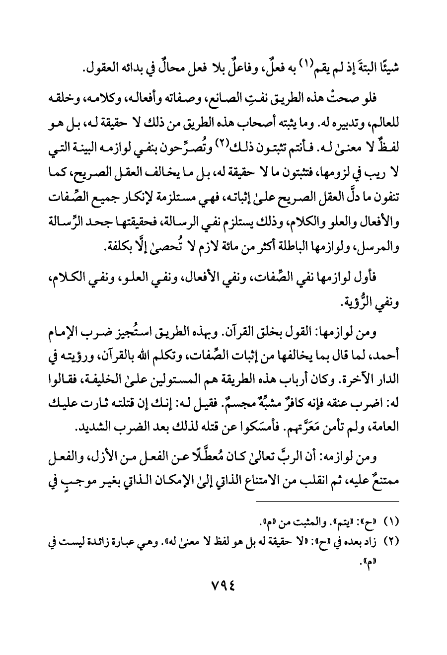 ومن لوازمها: القول بخلق القرآن. وبهذه الطريق استُجيز ضرب الإمام أحمد، لما قال بما يخالفها من إثبات الصِّفات، وتكلم الله بالقرآن، ورؤيته في الدار الآخرة. وكان أرباب هذه الطريقة هم المستولين على الخليفة، فقالوا له: اضرب عنقه فإنه كافرٌ مشبِّهٌ مجسمٌ. فقيل له: إنك إن قتلته ثارت عليك العامة، ولم تأمن مَعَرَّتهم. فأمسَكوا عن قتله لذلك بعد الضرب الشديد.