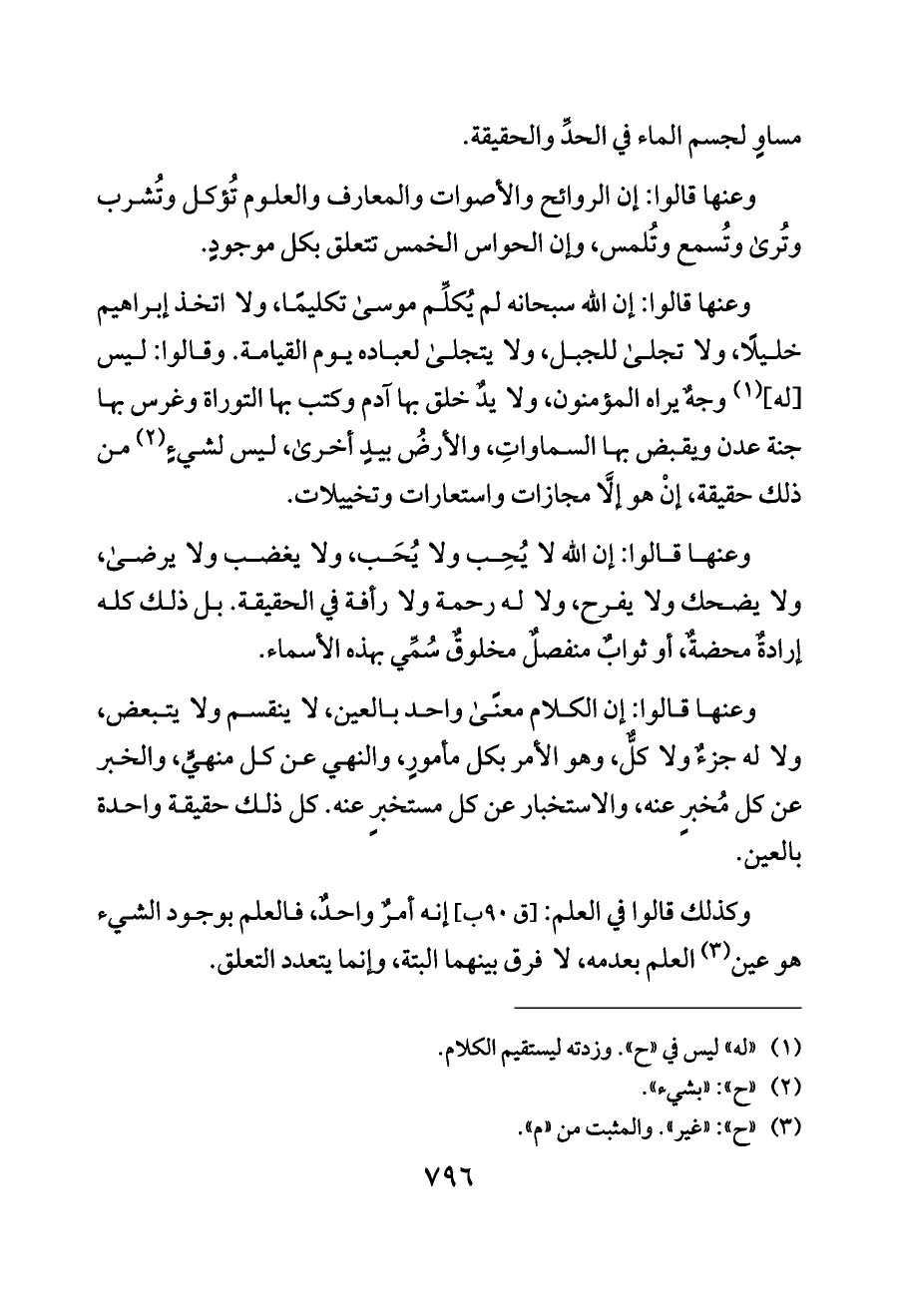وعنها قالوا: إن الكلام معنًى واحد بالعين، لا ينقسم ولا يتبعض، ولا له جزءٌ ولا كلٌّ، وهو الأمر بكل مأمورٍ، والنهي عن كل منهيٍّ، والخبر عن كل مُخبرٍ عنه، والاستخبار عن كل مستخبرٍ عنه. كل ذلك حقيقة واحدة بالعين.