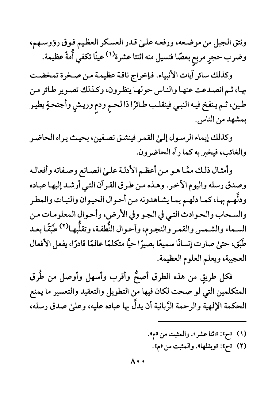 وكذلك سائر آيات الأنبياء. فإخراج ناقة عظيمة من صخرة تمخضت بها، ثم انصدعت عنها والناس حولها ينظرون، وكذلك تصوير طائر من طين، ثم ينفخ فيه النبي فينقلب طائرًا ذا لحمٍ ودمٍ وريشٍ وأجنحةٍ يطير بمشهد من الناس.