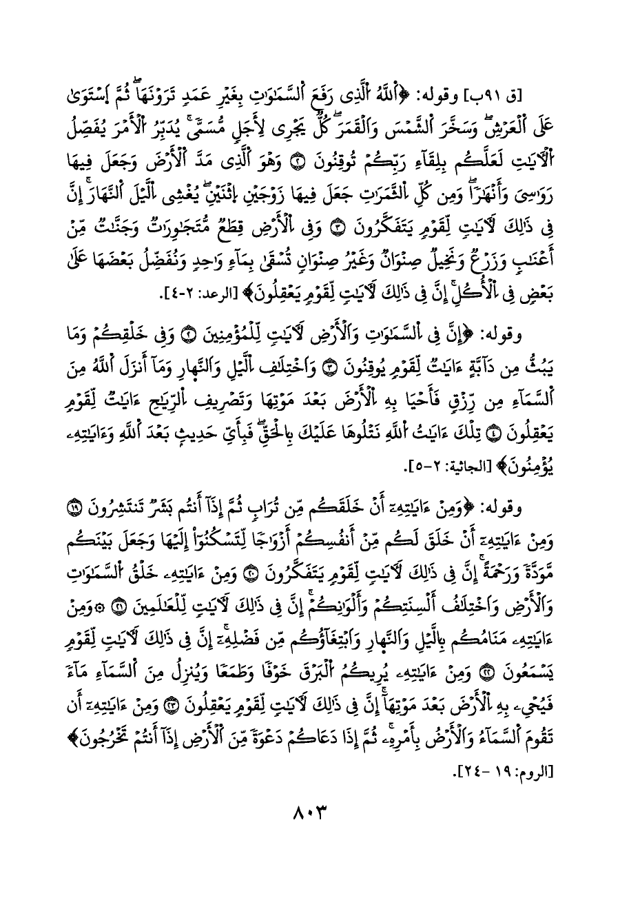 [ق ٩١ ب] وقوله: {اَللَّهُ اُلَّذِي رَفَعَ اَلسَّمَاوَاتِ بِغَيْرِ عَمَدٍ تَرَوْنَهَا ثُمَّ اَسْتَوَى عَلَى اَلْعَرْشِ وَسَخَّرَ اَلشَّمْسَ وَاَلْقَمَرَ كُلٌّ يَجْرِي لِأَجَلٍ مُّسَمًّى يُدَبِّرُ اُلْأَمْرَ يُفَصِّلُ اُلْأيَاتِ لَعَلَّكُم بِلِقَاءِ رَبِّكُمْ تُوقِنُونَ (٢) وَهْوَ اَلَّذِي مَدَّ اَلْأَرْضَ وَجَعَلَ فِيهَا رَوَاسِيَ وَأَنْهَارًا وَمِن كُلِّ اِلثَّمَرَاتِ جَعَلَ فِيهَا زَوْجَيْنِ اِثْنَيْنِ يُغْشِي اِلَّيْلَ اَلنَّهَارَ إِنَّ فِي ذَلِكَ لَأيَاتٍ لِّقَوْمٍ يَتَفَكَّرُونَ (٣) وَفِي اِلْأَرْضِ قِطَعٌ مُّتَجَاوِرَاتٌ وَجَنَّاتٌ مِّنْ أَعْنَابٍ وَزَرْعٌ وَنَخِيلٌ صِنْوَانٌ وَغَيْرُ صِنْوَانٍ تُسْقَى بِمَاءٍ وَاحِدٍ وَنُفَضِّلُ بَعْضَهَا عَلَى بَعْضٍ فِي اِلْأُكُلِ إِنَّ فِي ذَلِكَ لَأيَاتٍ لِّقَوْمٍ يَعْقِلُونَ} [الرعد: ٢ - ٤].