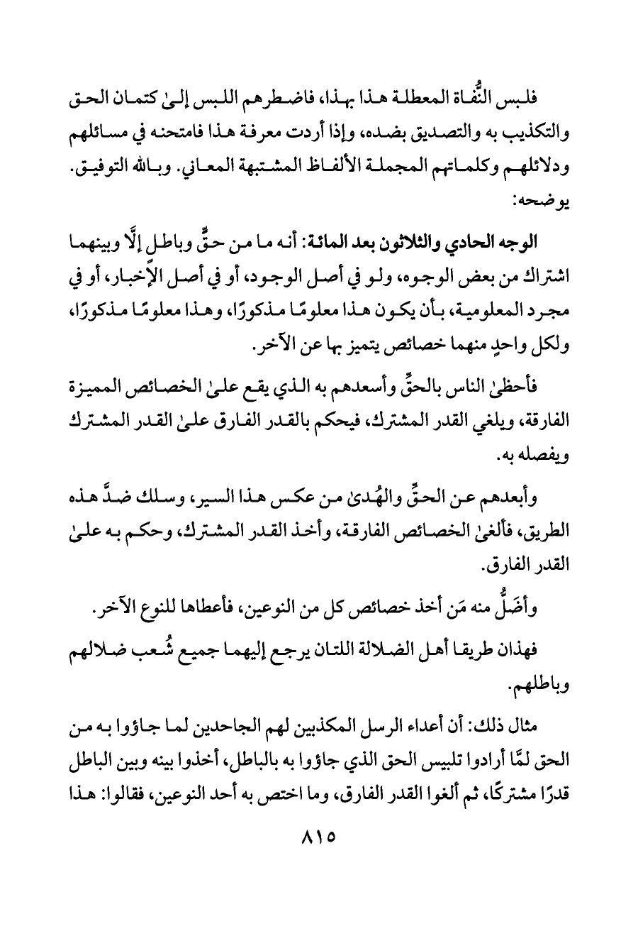 الوجه الحادي والثلاثون بعد المائة: أنه ما من حقٍّ وباطلٍ إلَّا وبينهما اشتراك من بعض الوجوه، ولو في أصل الوجود، أو في أصل الإخبار، أو في مجرد المعلومية، بأن يكون هذا معلومًا مذكورًا، وهذا معلومًا مذكورًا، ولكل واحدٍ منهما خصائص يتميز بها عن الآخر.
