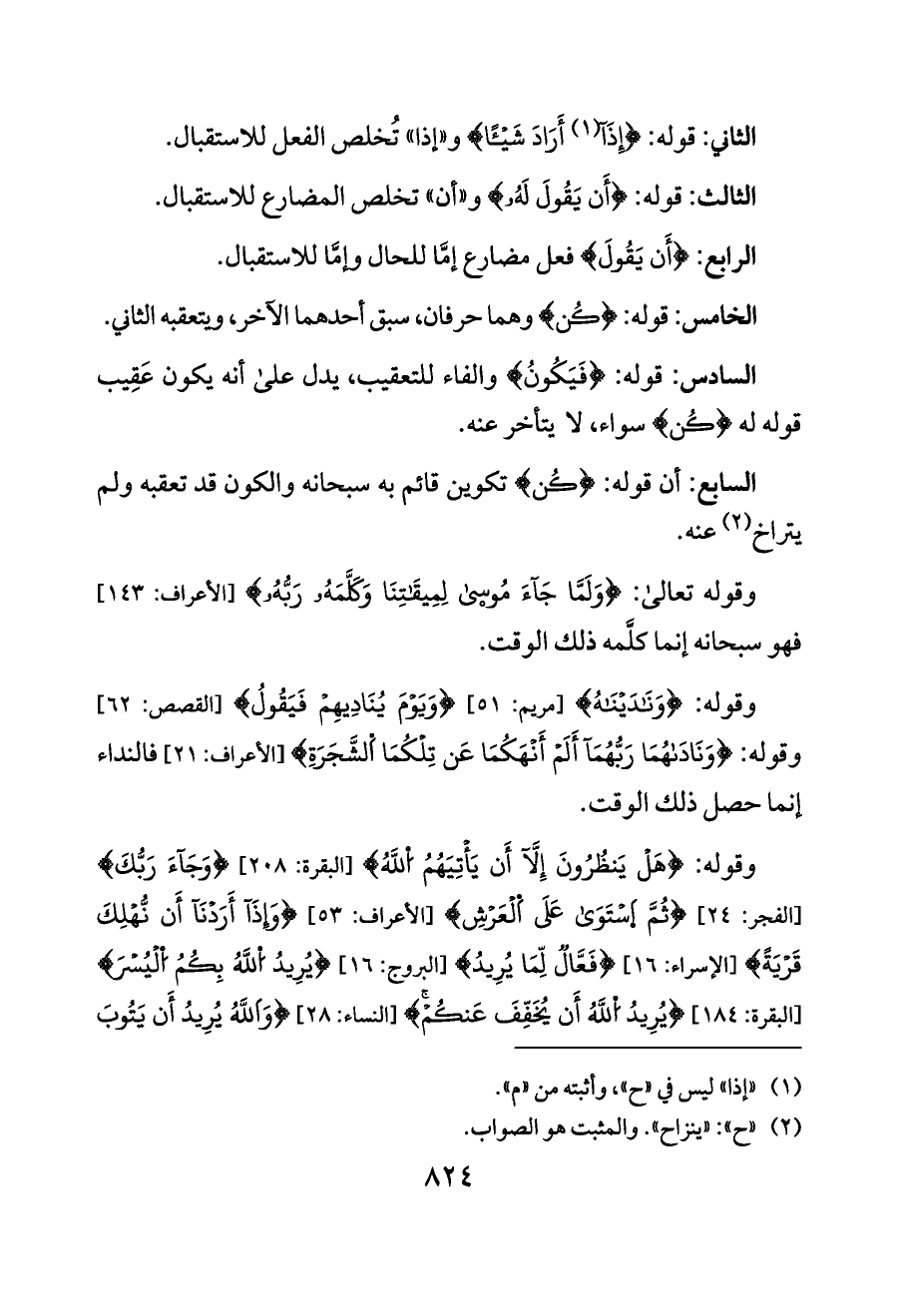 وقوله: {هَلْ يَنظُرُونَ إِلَّا أَن يَأْتِيَهُمُ اُللَّهُ} [البقرة: ٢٠٨] {وَجَاءَ رَبُّكَ} [الفجر: ٢٤] {ثُمَّ اَسْتَوَى عَلَى اَلْعَرْشِ} [الأعراف: ٥٣] {وَإِذَا أَرَدْنَا أَن نُّهْلِكَ قَرْيَةً} [الإسراء: ١٦] {فَعَّالٌ لِّمَا يُرِيدُ} [البروج: ١٦] {يُرِيدُ اُللَّهُ بِكُمُ اُلْيُسْرَ} [البقرة: ١٨٤] {يُرِيدُ اُللَّهُ أَن يُخَفِّفَ عَنكُمْ} [النساء: ٢٨] {وَاَللَّهُ يُرِيدُ أَن يَتُوبَ