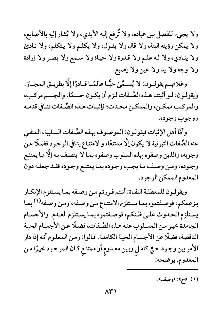 وأمَّا أهل الإثبات فيقولون: الموصوف بهذه الصِّفات السلبية، المنفي عنه الصِّفات الثبوتية لا يكون إلَّا ممتنعًا، والامتناع ينافي الوجود فضلًا عن وجوبه، والذين وصفوه بهذه السلوب وصفوه بما لا يتصف به إلَّا ما يمتنع وجوده، ومن وصف ما يجب وجوده بما يمتنع وجوده فقد جعله دون المعدوم الممكن الوجود.