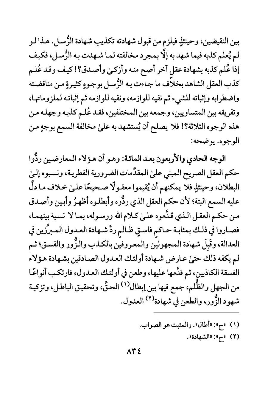 الوجه الحادي والأربعون بعد المائة: وهو أن هؤلاء المعارضين ردُّوا حكم العقل الصريح المبني على المقدِّمات الضرورية الفطرية، ونسبوه إلى البطلان، وحينئذٍ فلا يمكنهم أن يُقيموا معقولًا صحيحًا على خلاف ما دلَّ عليه السمع البتة؛ لأن حكم العقل الذي ردُّوه وأبطلوه أظهرُ وأبين وأصدق من حكم العقل الذي قدَّموه على كلام الله ورسوله، بما لا نسبة بينهما، فصاروا في ذلك بمثابة حاكمٍ فاسقٍ ظالمٍ ردَّ شهادة العدول المبرِّزين في العدالة، وقَبِلَ شهادة المجهولين والمعروفين بالكذب والزُّور والفسق؛ ثم لم يكفه ذلك حتى عارض شهادة أولئك العدول الصادقين بشهادة هؤلاء الفسقة الكاذبين، ثم قدَّمها عليها، وطعن في أولئك العدول، فارتكب أنواعًا من الجهل والظُّلم، جمع فيها بين إبطال (¬١) الحقِّ، وتحقيق الباطل، وتزكية شهود الزُّور، والطعن في شهادة (¬٢) العدول.