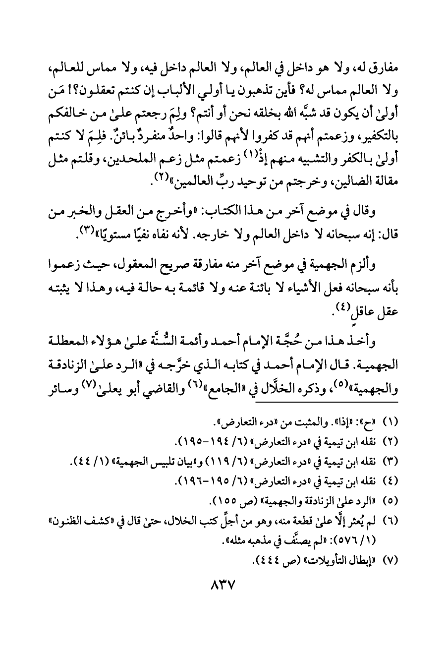 وألزم الجهمية في موضع آخر منه مفارقة صريح المعقول، حيث زعموا بأنه سبحانه فعل الأشياء لا بائنة عنه ولا قائمة به حالة فيه، وهذا لا يثبته عقل عاقلٍ (¬٤).