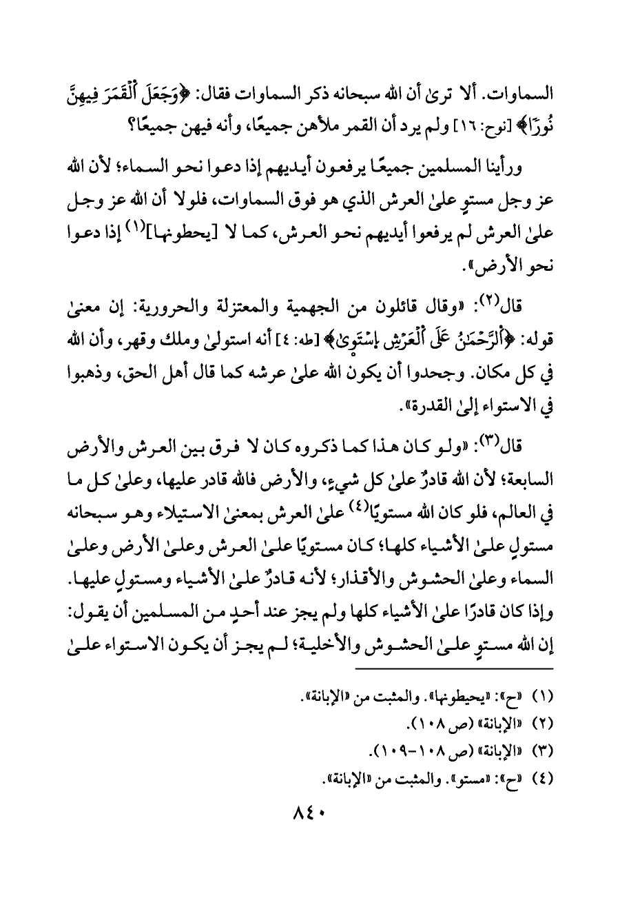 قال (¬٣): «ولو كان هذا كما ذكروه كان لا فرق بين العرش والأرض السابعة؛ لأن الله قادرٌ على كل شيءٍ، والأرض فالله قادر عليها، وعلى كل ما في العالم، فلو كان الله مستويًا (¬٤) على العرش بمعنى الاستيلاء وهو سبحانه مستولٍ على الأشياء كلها؛ كان مستويًا على العرش وعلى الأرض وعلى السماء وعلى الحشوش والأقذار؛ لأنه قادرٌ على الأشياء ومستولٍ عليها. وإذا كان قادرًا على الأشياء كلها ولم يجز عند أحدٍ من المسلمين أن يقول: إن الله مستوٍ على الحشوش والأخلية؛ لم يجز أن يكون الاستواء على