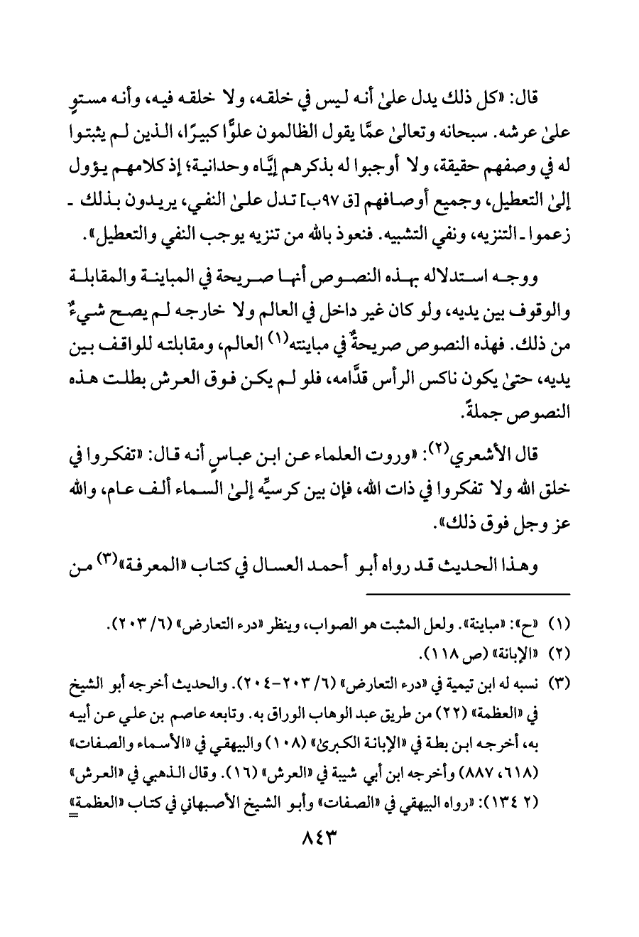 قال: «كل ذلك يدل على أنه ليس في خلقه، ولا خلقه فيه، وأنه مستوٍ على عرشه. سبحانه وتعالى عمَّا يقول الظالمون علوًّا كبيرًا، الذين لم يثبتوا له في وصفهم حقيقة، ولا أوجبوا له بذكرهم إيَّاه وحدانية؛ إذ كلامهم يؤول إلى التعطيل، وجميع أوصافهم [ق ٩٧ ب] تدل على النفي، يريدون بذلك ـ زعموا ـ التنزيه، ونفي التشبيه. فنعوذ بالله من تنزيه يوجب النفي والتعطيل».