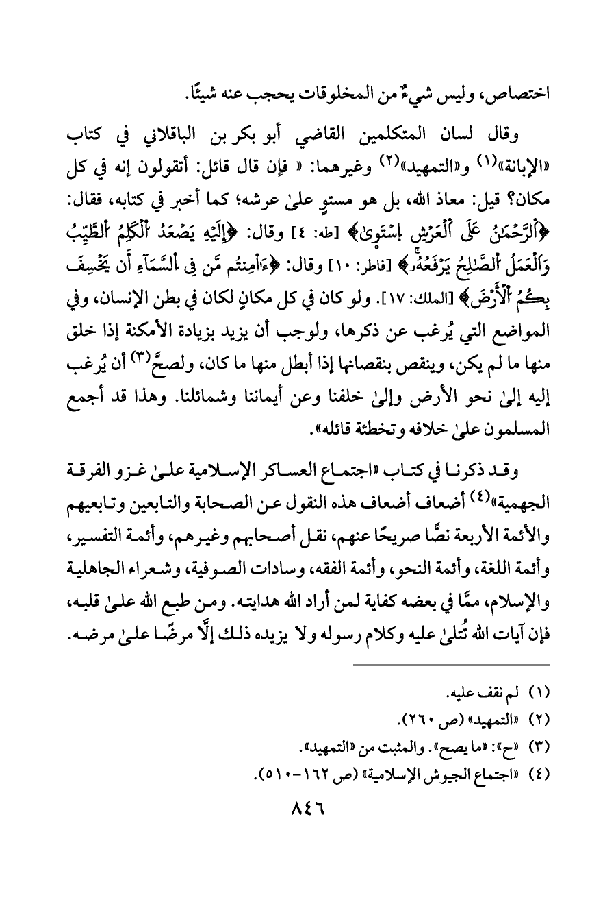 وقال لسان المتكلمين القاضي أبو بكر بن الباقلاني في كتاب «الإبانة» (¬١) و «التمهيد» (¬٢) وغيرهما: «فإن قال قائل: أتقولون إنه في كل مكان؟ قيل: معاذ الله، بل هو مستوٍ على عرشه؛ كما أخبر في كتابه، فقال: {اَلرَّحْمَنُ عَلَى اَلْعَرْشِ اِسْتَوى} [طه: ٤] وقال: {إِلَيْهِ يَصْعَدُ اُلْكَلِمُ اُلطَّيِّبُ وَاَلْعَمَلُ اُلصَّالِحُ يَرْفَعُهُ} [فاطر: ١٠] وقال: {آامِنتُم مَّن فِي اِلسَّمَاءِ اَن يَخْسِفَ بِكُمُ اُلْأَرْضَ} [الملك: ١٧]. ولو كان في كل مكانٍ لكان في بطن الإنسان، وفي المواضع التي يُرغب عن ذكرها، ولوجب أن يزيد بزيادة الأمكنة إذا خلق منها ما لم يكن، وينقص بنقصانها إذا أبطل منها ما كان، ولصحَّ (¬٣) أن يُرغب إليه إلى نحو الأرض وإلى خلفنا وعن أيماننا وشمائلنا. وهذا قد أجمع المسلمون على خلافه وتخطئة قائله».