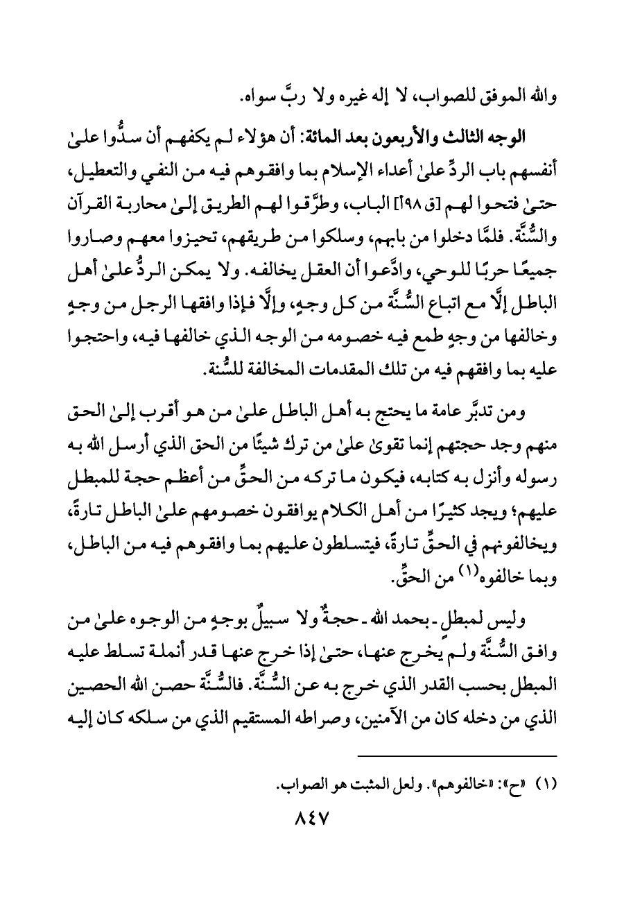 الوجه الثالث والأربعون بعد المائة: أن هؤلاء لم يكفهم أن سدُّوا على أنفسهم باب الردِّ على أعداء الإسلام بما وافقوهم فيه من النفي والتعطيل، حتى فتحوا لهم [ق ٩٨ أ] الباب، وطرَّقوا لهم الطريق إلى محاربة القرآن والسُّنَّة. فلمَّا دخلوا من بابهم، وسلكوا من طريقهم، تحيزوا معهم وصاروا جميعًا حربًا للوحي، وادَّعوا أن العقل يخالفه. ولا يمكن الردُّ على أهل الباطل إلَّا مع اتباع السُّنَّة من كل وجهٍ، وإلَّا فإذا وافقها الرجل من وجهٍ وخالفها من وجهٍ طمع فيه خصومه من الوجه الذي خالفها فيه، واحتجوا عليه بما وافقهم فيه من تلك المقدمات المخالفة للسُّنة.