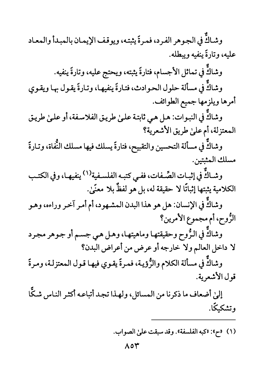 وشاكٌّ في إثبات الصِّفات، ففي كتبه الفلسفية (¬١) ينفيها، وفي الكتب الكلامية يثبتها إثباتًا لا حقيقة له، بل هو لفظٌ بلا معنًى.