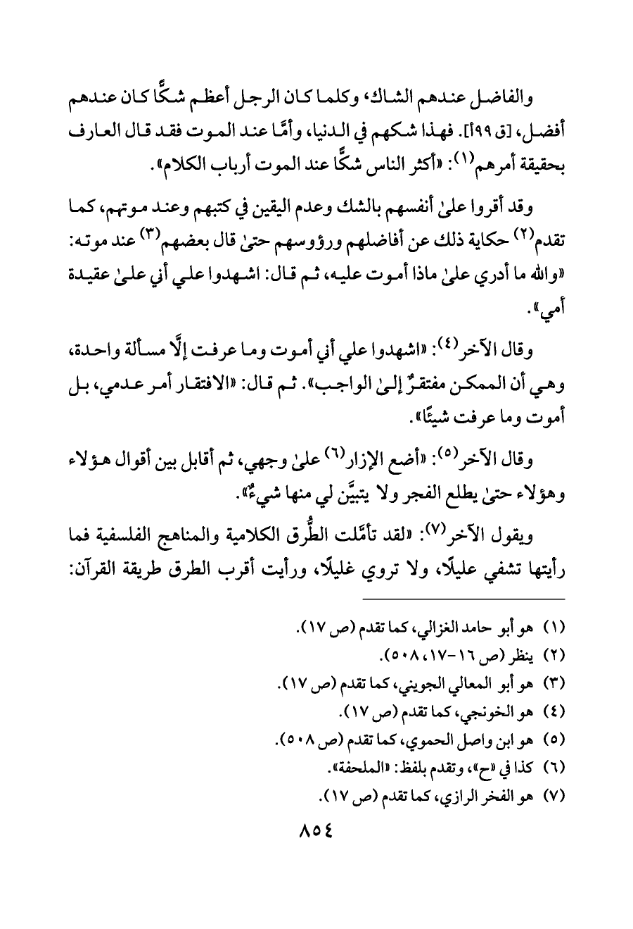 وقال الآخر (¬٤): «اشهدوا علي أني أموت وما عرفت إلَّا مسألة واحدة، وهي أن الممكن مفتقرٌ إلى الواجب». ثم قال: «الافتقار أمر عدمي، بل أموت وما عرفت شيئًا».