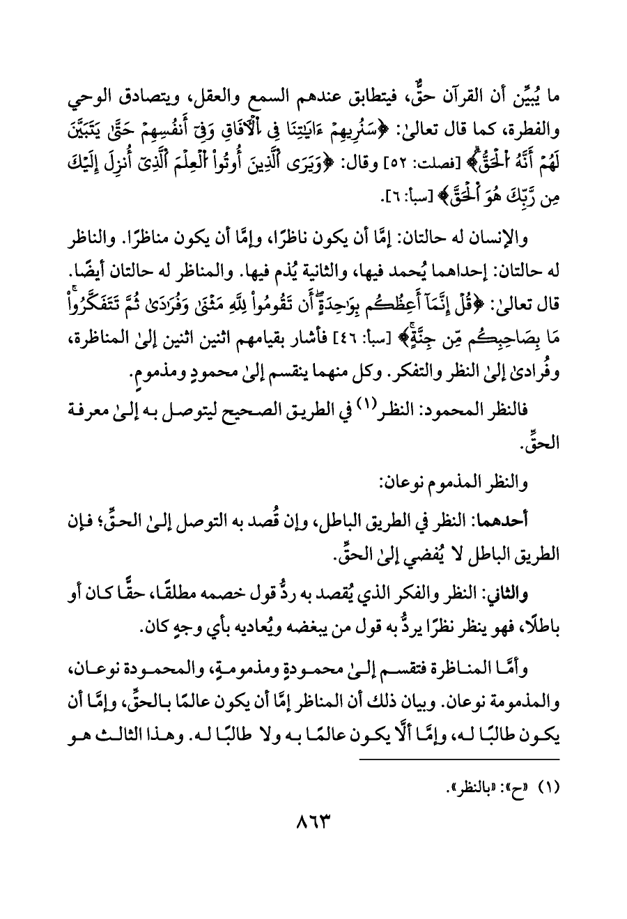 والإنسان له حالتان: إمَّا أن يكون ناظرًا، وإمَّا أن يكون مناظرًا. والناظر له حالتان: إحداهما يُحمد فيها، والثانية يُذم فيها. والمناظر له حالتان أيضًا. قال تعالى: {قُلْ إِنَّمَا أَعِظُكُم بِوَاحِدَةٍ أَن تَقُومُوا لِلَّهِ مَثْنَى وَفُرَادَى ثُمَّ تَتَفَكَّرُوا مَا بِصَاحِبِكُم مِّن جِنَّةٍ} [سبأ: ٤٦] فأشار بقيامهم اثنين اثنين إلى المناظرة، وفُرادى إلى النظر والتفكر. وكل منهما ينقسم إلى محمودٍ ومذمومٍ.