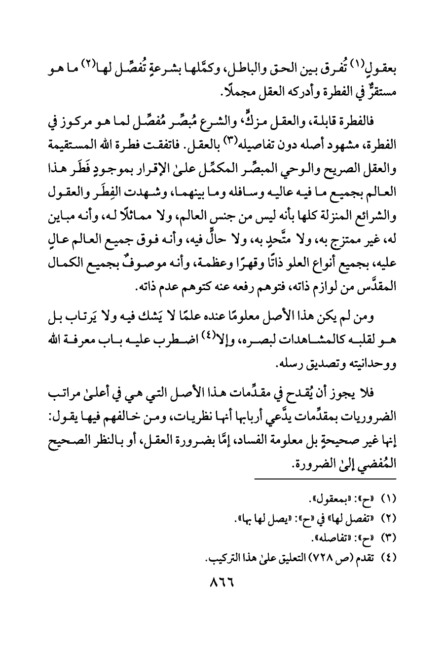 فلا يجوز أن يُقدح في مقدِّمات هذا الأصل التي هي في أعلى مراتب الضروريات بمقدِّمات يدَّعي أربابها أنها نظريات، ومن خالفهم فيها يقول: إنها غير صحيحةٍ بل معلومة الفساد، إمَّا بضرورة العقل، أو بالنظر الصحيح المُفضي إلى الضرورة.