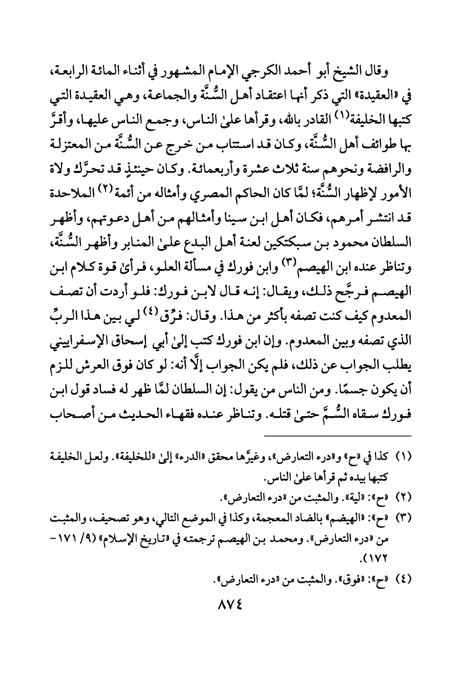 وقال الشيخ أبو أحمد الكرجي الإمام المشهور في أثناء المائة الرابعة، في «العقيدة» التي ذكر أنها اعتقاد أهل السُّنَّة والجماعة، وهي العقيدة التي كتبها الخليفة (¬١) القادر بالله، وقرأها على الناس، وجمع الناس عليها، وأقرَّ بها طوائف أهل السُّنَّة، وكان قد استتاب من خرج عن السُّنَّة من المعتزلة والرافضة ونحوهم سنة ثلاث عشرة وأربعمائة. وكان حينئذٍ قد تحرَّك ولاة الأمور لإظهار السُّنَّة؛ لمَّا كان الحاكم المصري وأمثاله من أئمة (¬٢) الملاحدة قد انتشر أمرهم، فكان أهل ابن سينا وأمثالهم من أهل دعوتهم، وأظهر السلطان محمود بن سبكتكين لعنة أهل البدع على المنابر وأظهر السُّنَّة، وتناظر عنده ابن الهيصم (¬٣) وابن فورك في مسألة العلو، فرأى قوة كلام ابن الهيصم فرجَّح ذلك، ويقال: إنه قال لابن فورك: فلو أردت أن تصف المعدوم كيف كنت تصفه بأكثر من هذا. وقال: فرِّق (¬٤) لي بين هذا الربِّ الذي تصفه وبين المعدوم. وإن ابن فورك كتب إلى أبي إسحاق الإسفراييني يطلب الجواب عن ذلك، فلم يكن الجواب إلَّا أنه: لو كان فوق العرش للزم أن يكون جسمًا. ومن الناس من يقول: إن السلطان لمَّا ظهر له فساد قول ابن فورك سقاه السُّمَّ حتى قتله. وتناظر عنده فقهاء الحديث من أصحاب