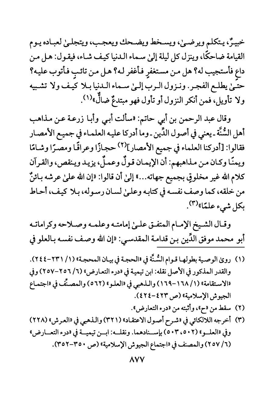 وقال الشيخ الإمام المتفق على إمامته وعلمه وصلاحه وكراماته أبو محمد موفق الدِّين بن قدامة المقدسي: «إن الله وصف نفسه بالعلو في