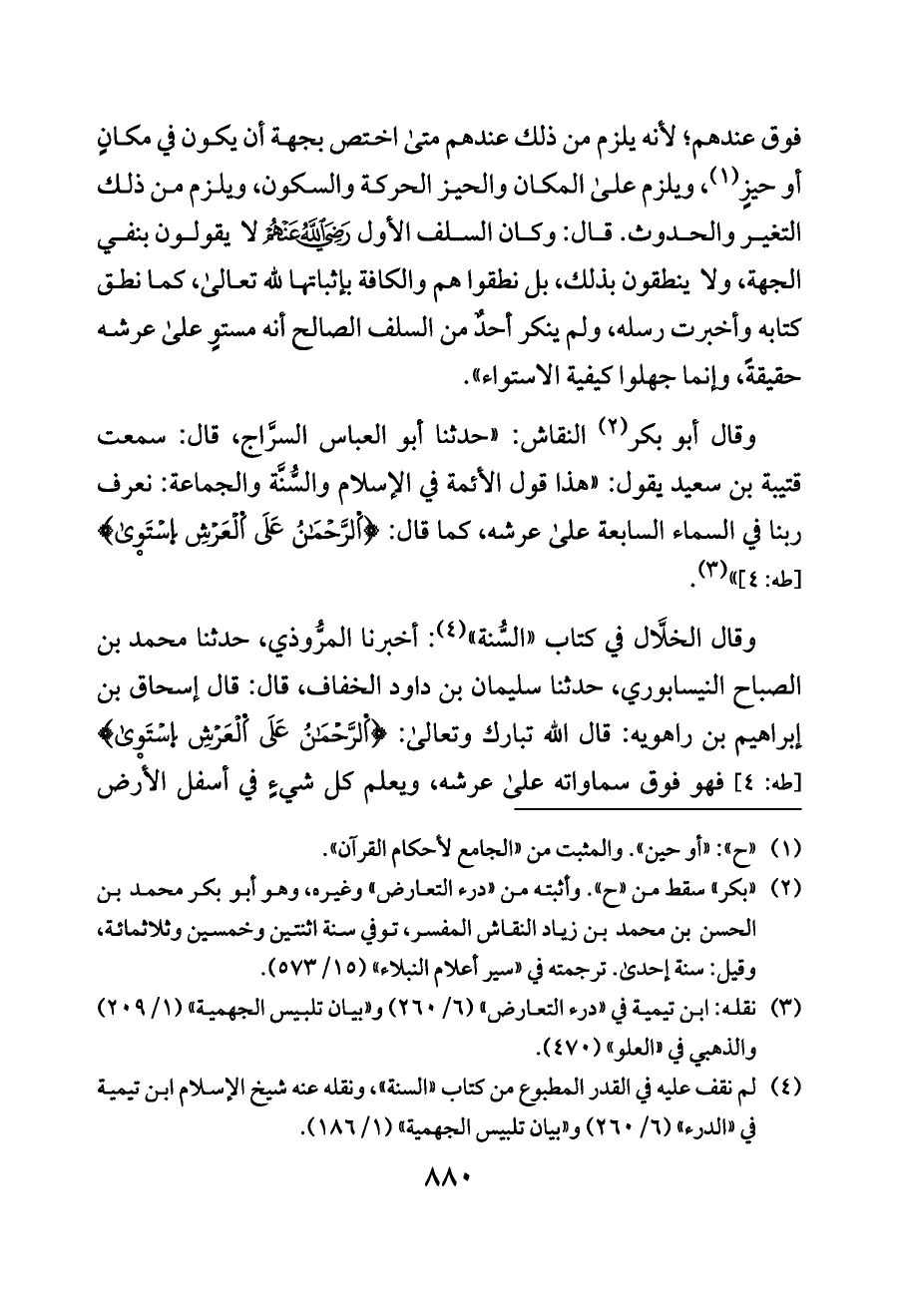 وقال أبو بكر (¬٢) النقاش: «حدثنا أبو العباس السرَّاج، قال: سمعت قتيبة بن سعيد يقول: «هذا قول الأئمة في الإسلام والسُّنَّة والجماعة: نعرف ربنا في السماء السابعة على عرشه، كما قال: {اَلرَّحْمَنُ عَلَى اَلْعَرْشِ اِسْتَوى} [طه: ٤]» (¬٣).