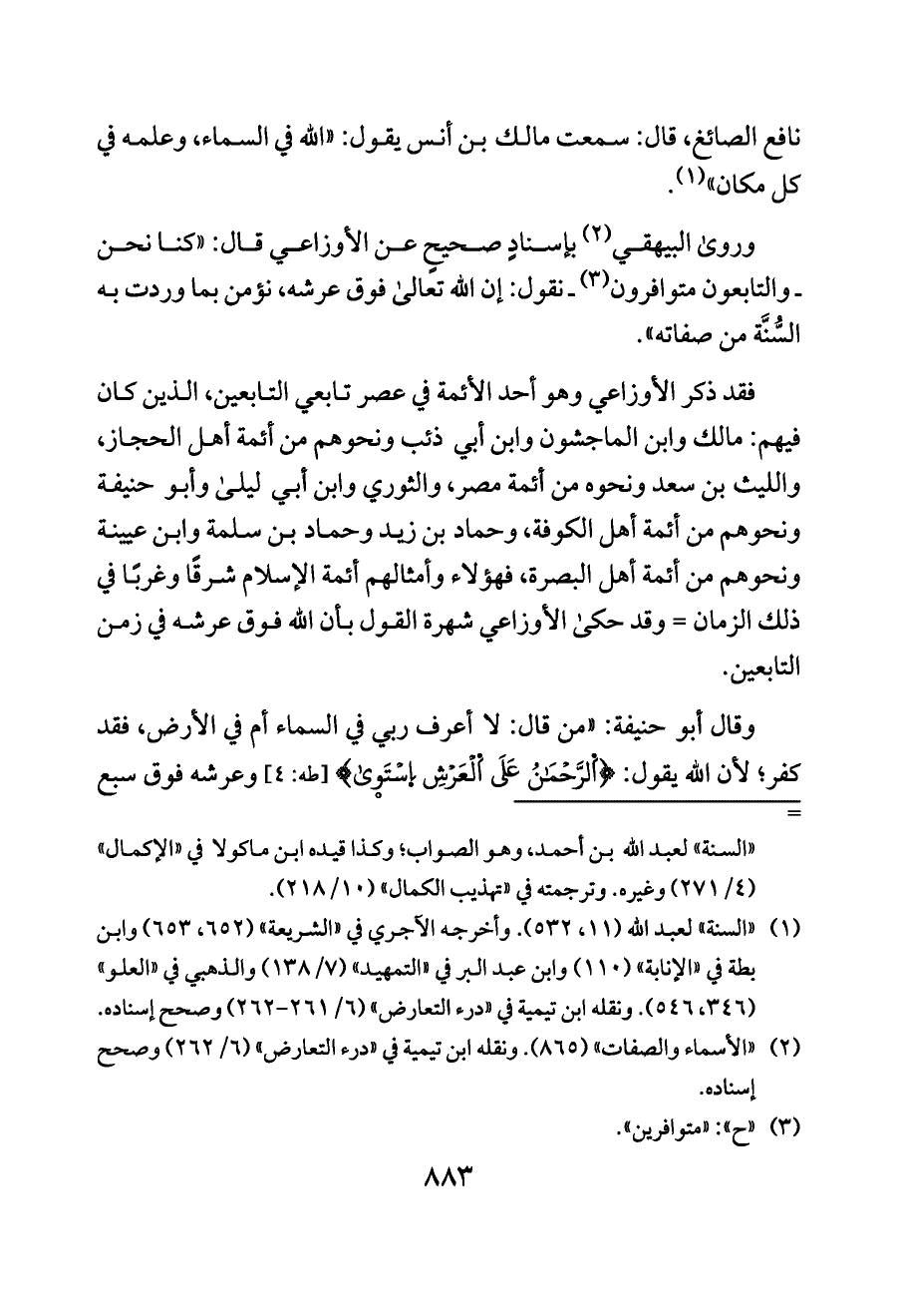 فقد ذكر الأوزاعي وهو أحد الأئمة في عصر تابعي التابعين، الذين كان فيهم: مالك وابن الماجشون وابن أبي ذئب ونحوهم من أئمة أهل الحجاز، والليث بن سعد ونحوه من أئمة مصر، والثوري وابن أبي ليلى وأبو حنيفة ونحوهم من أئمة أهل الكوفة، وحماد بن زيد وحماد بن سلمة وابن عيينة ونحوهم من أئمة أهل البصرة، فهؤلاء وأمثالهم أئمة الإسلام شرقًا وغربًا في ذلك الزمان = وقد حكى الأوزاعي شهرة القول بأن الله فوق عرشه في زمن التابعين.