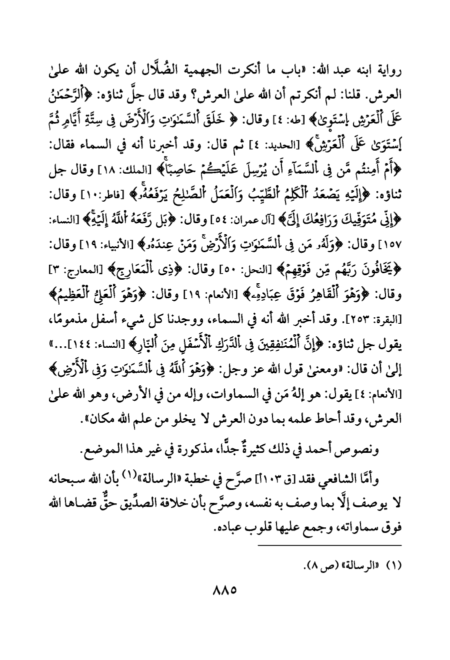 {أَمْ أَمِنتُم مَّن فِي اِلسَّمَاءِ اَن يُرْسِلَ عَلَيْكُمْ حَاصِبًا} [الملك: ١٨] وقال جل ثناؤه: {إِلَيْهِ يَصْعَدُ اُلْكَلِمُ اُلطَّيِّبُ وَاَلْعَمَلُ اُلصَّالِحُ يَرْفَعُهُ} [فاطر:١٠] وقال: {إِنِّي مُتَوَفِّيكَ وَرَافِعُكَ إِلَيَّ} [آل عمران: ٥٤] وقال: {بَل رَّفَعَهُ اُللَّهُ إِلَيْهِ} [النساء: ١٥٧] وقال: {وَلَهُ مَن فِي اِلسَّمَاوَاتِ وَاَلْأَرْضِ وَمَنْ عِندَهُ} [الأنبياء: ١٩] وقال: {يَخَافُونَ رَبَّهُم مِّن فَوْقِهِمْ} [النحل: ٥٠] وقال: {ذِي اِلْمَعَارِجِ} [المعارج: ٣] وقال: {وَهْوَ اَلْقَاهِرُ فَوْقَ عِبَادِهِ} [الأنعام: ١٩] وقال: {وَهْوَ اَلْعَلِيُّ اُلْعَظِيمُ} [البقرة: ٢٥٣]. وقد أخبر الله أنه في السماء، ووجدنا كل شيء أسفل مذمومًا، يقول جل ثناؤه: {إِنَّ اَلْمُنَافِقِينَ فِي اِلدَّرَكِ اِلْأَسْفَلِ مِنَ اَلنّارِ} [النساء: ١٤٤] ... » إلى أن قال: «ومعنى قول الله عز وجل: {وَهْوَ اَللَّهُ فِي اِلسَّمَاوَاتِ وَفِي اِلْأَرْضِ} [الأنعام: ٤] يقول: هو إلهُ مَن في السماوات، وإله من في الأرض، وهو الله على العرش، وقد أحاط علمه بما دون العرش لا يخلو من علم الله مكان».