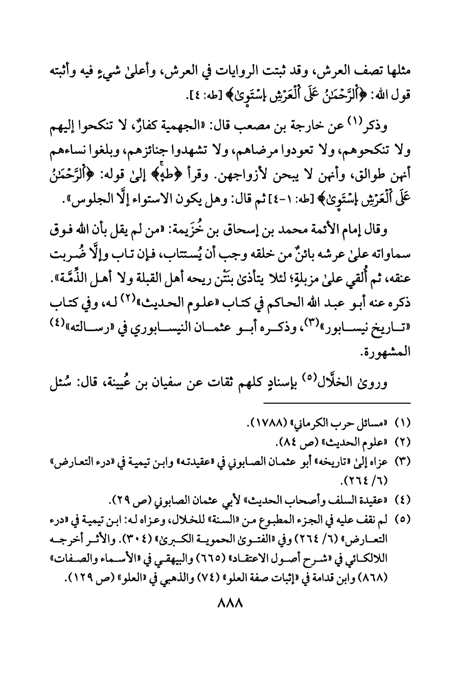 وقال إمام الأئمة محمد بن إسحاق بن خُزَيمة: «من لم يقل بأن الله فوق سماواته على عرشه بائنٌ من خلقه وجب أن يُستتاب، فإن تاب وإلَّا ضُربت عنقه، ثم أُلقي على مزبلةٍ؛ لئلا يتأذى بنَتْن ريحه أهل القبلة ولا أهل الذِّمَّة». ذكره عنه أبو عبد الله الحاكم في كتاب «علوم الحديث» (¬٢) له، وفي كتاب «تاريخ نيسابور» (¬٣)، وذكره أبو عثمان النيسابوري في «رسالته» (¬٤) المشهورة.