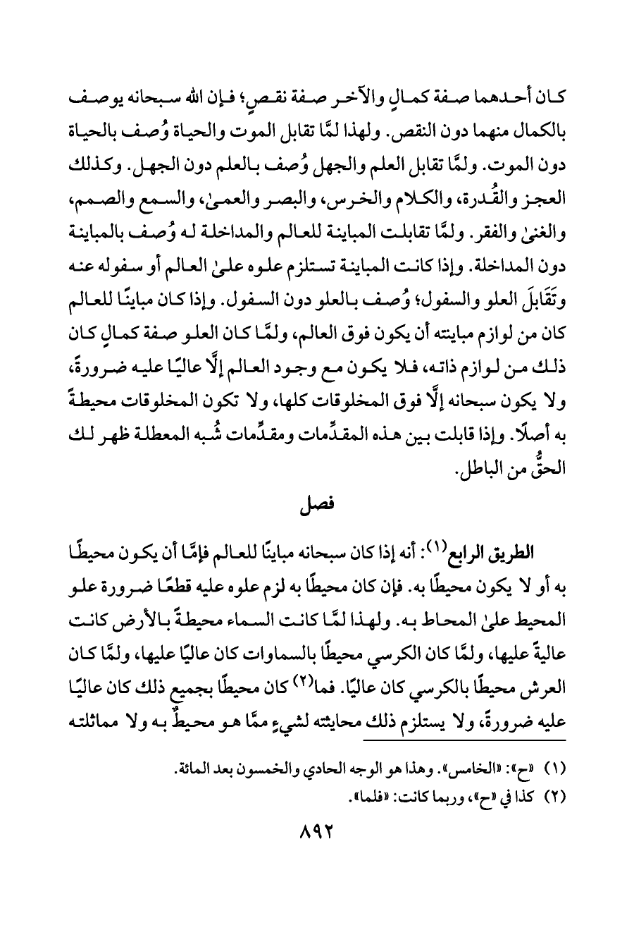كان أحدهما صفة كمالٍ والآخر صفة نقصٍ؛ فإن الله سبحانه يوصف بالكمال منهما دون النقص. ولهذا لمَّا تقابل الموت والحياة وُصف بالحياة دون الموت. ولمَّا تقابل العلم والجهل وُصف بالعلم دون الجهل. وكذلك العجز والقُدرة، والكلام والخرس، والبصر والعمى، والسمع والصمم، والغنى والفقر. ولمَّا تقابلت المباينة للعالم والمداخلة له وُصف بالمباينة دون المداخلة. وإذا كانت المباينة تستلزم علوه على العالم أو سفوله عنه وتَقَابلَ العلو والسفول؛ وُصف بالعلو دون السفول. وإذا كان مباينًا للعالم كان من لوازم مباينته أن يكون فوق العالم، ولمَّا كان العلو صفة كمالٍ كان ذلك من لوازم ذاته، فلا يكون مع وجود العالم إلَّا عاليًا عليه ضرورةً، ولا يكون سبحانه إلَّا فوق المخلوقات كلها، ولا تكون المخلوقات محيطةً به أصلًا. وإذا قابلت بين هذه المقدِّمات ومقدِّمات شُبه المعطلة ظهر لك الحقُّ من الباطل.
