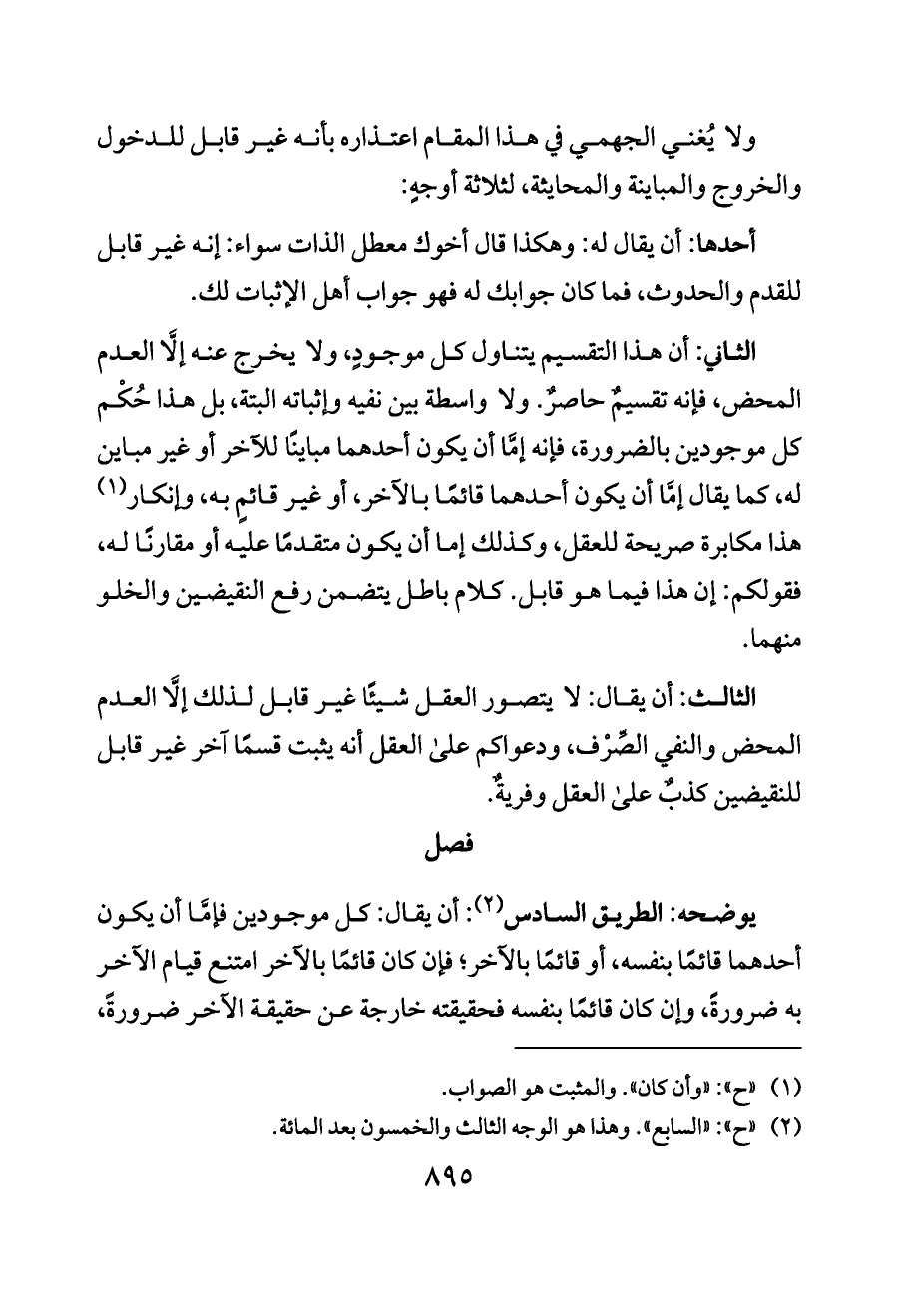 الثاني: أن هذا التقسيم يتناول كل موجودٍ، ولا يخرج عنه إلَّا العدم المحض، فإنه تقسيمٌ حاصرٌ. ولا واسطة بين نفيه وإثباته البتة، بل هذا حُكْم كل موجودين بالضرورة، فإنه إمَّا أن يكون أحدهما مباينًا للآخر أو غير مباين له، كما يقال إمَّا أن يكون أحدهما قائمًا بالآخر، أو غير قائمٍ به، وإنكار (¬١) هذا مكابرة صريحة للعقل، وكذلك إما أن يكون متقدمًا عليه أو مقارنًا له، فقولكم: إن هذا فيما هو قابل. كلام باطل يتضمن رفع النقيضين والخلو منهما.