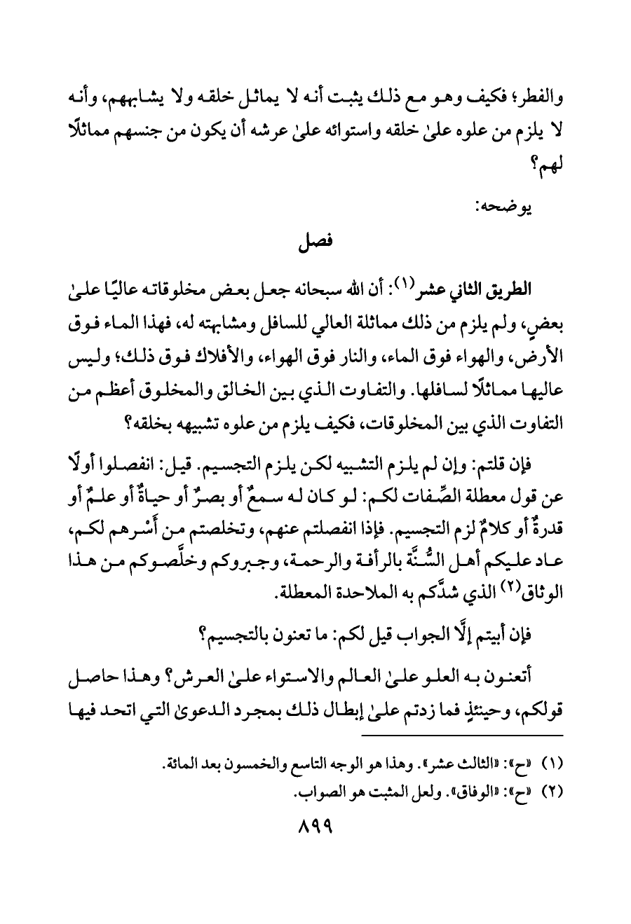 فإن قلتم: وإن لم يلزم التشبيه لكن يلزم التجسيم. قيل: انفصلوا أولًا عن قول معطلة الصِّفات لكم: لو كان له سمعٌ أو بصرٌ أو حياةٌ أو علمٌ أو قدرةٌ أو كلامٌ لزم التجسيم. فإذا انفصلتم عنهم، وتخلصتم من أَسْرهم لكم، عاد عليكم أهل السُّنَّة بالرأفة والرحمة، وجبروكم وخلَّصوكم من هذا الوثاق (¬٢) الذي شدَّكم به الملاحدة المعطلة.