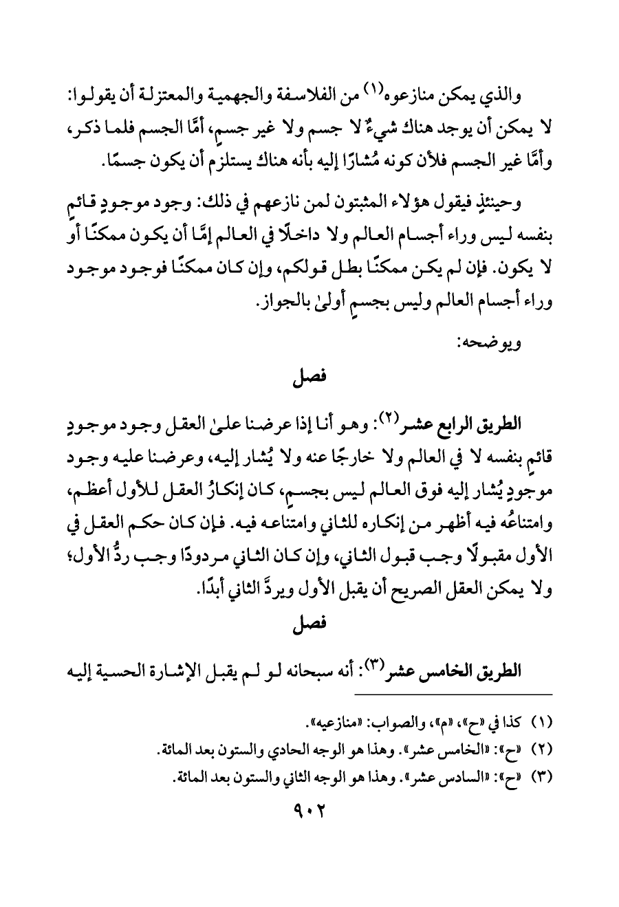 الطريق الرابع عشر (¬٢): وهو أنا إذا عرضنا على العقل وجود موجودٍ قائمٍ بنفسه لا في العالم ولا خارجًا عنه ولا يُشار إليه، وعرضنا عليه وجود موجودٍ يُشار إليه فوق العالم ليس بجسمٍ، كان إنكارُ العقل للأول أعظم، وامتناعُه فيه أظهر من إنكاره للثاني وامتناعه فيه. فإن كان حكم العقل في الأول مقبولًا وجب قبول الثاني، وإن كان الثاني مردودًا وجب ردُّ الأول؛ ولا يمكن العقل الصريح أن يقبل الأول ويردَّ الثاني أبدًا.