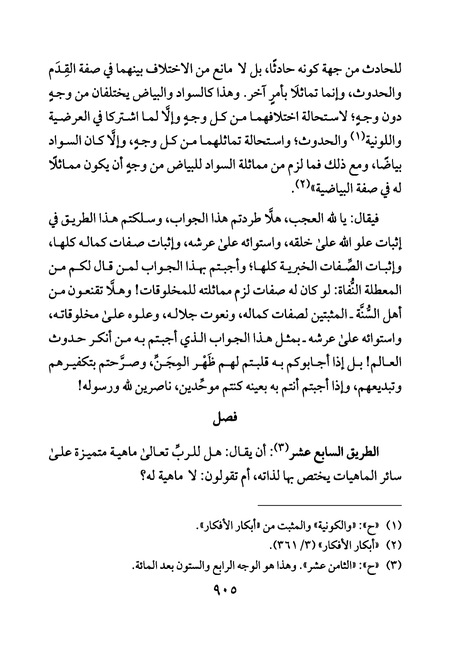 فيقال: يا لله العجب، هلَّا طردتم هذا الجواب، وسلكتم هذا الطريق في إثبات علو الله على خلقه، واستوائه على عرشه، وإثبات صفات كماله كلها، وإثبات الصِّفات الخبرية كلها؛ وأجبتم بهذا الجواب لمن قال لكم من المعطلة النُّفاة: لو كان له صفات لزم مماثلته للمخلوقات! وهلَّا تقنعون من أهل السُّنَّة ـ المثبتين لصفات كماله، ونعوت جلاله، وعلوه على مخلوقاته، واستوائه على عرشه ـ بمثل هذا الجواب الذي أجبتم به من أنكر حدوث العالم! بل إذا أجابوكم به قلبتم لهم ظَهْر المِجَنِّ، وصرَّحتم بتكفيرهم وتبديعهم، وإذا أجبتم أنتم به بعينه كنتم موحِّدين، ناصرين لله ورسوله!
