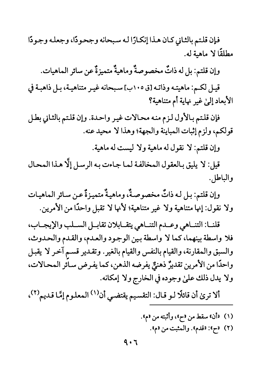 وإن قلتم: بل له ذاتٌ مخصوصةٌ، وماهيةٌ متميزةٌ عن سائر الماهيات ولا نقول: إنها متناهية ولا غير متناهية؛ لأنها لا تقبل واحدًا من الأمرين.