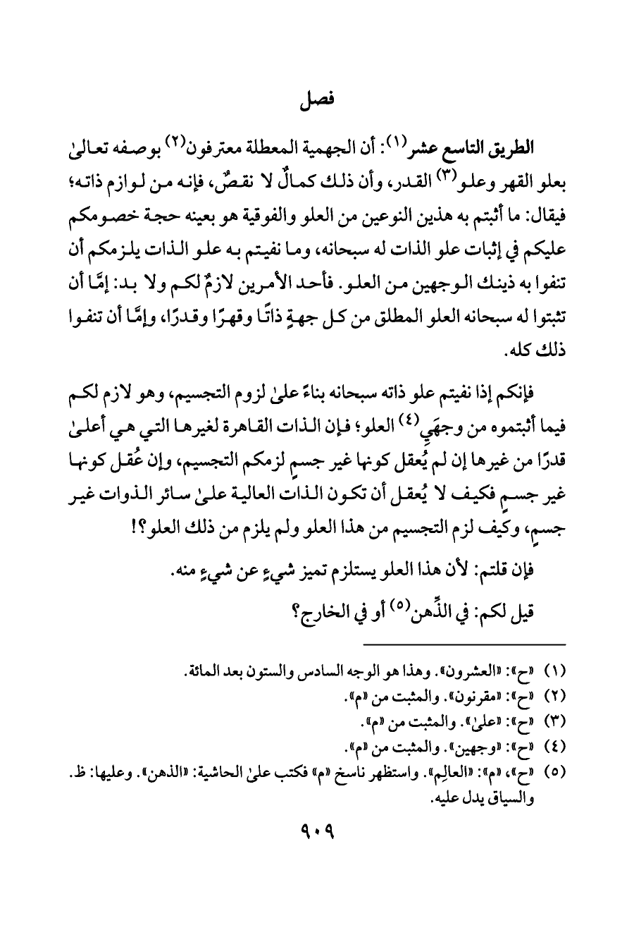 فإنكم إذا نفيتم علو ذاته سبحانه بناءً على لزوم التجسيم، وهو لازم لكم فيما أثبتموه من وجهَيِ (¬٤) العلو؛ فإن الذات القاهرة لغيرها التي هي أعلى قدرًا من غيرها إن لم يُعقل كونها غير جسمٍ لزمكم التجسيم، وإن عُقل كونها غير جسمٍ فكيف لا يُعقل أن تكون الذات العالية على سائر الذوات غير جسمٍ، وكيف لزم التجسيم من هذا العلو ولم يلزم من ذلك العلو؟!