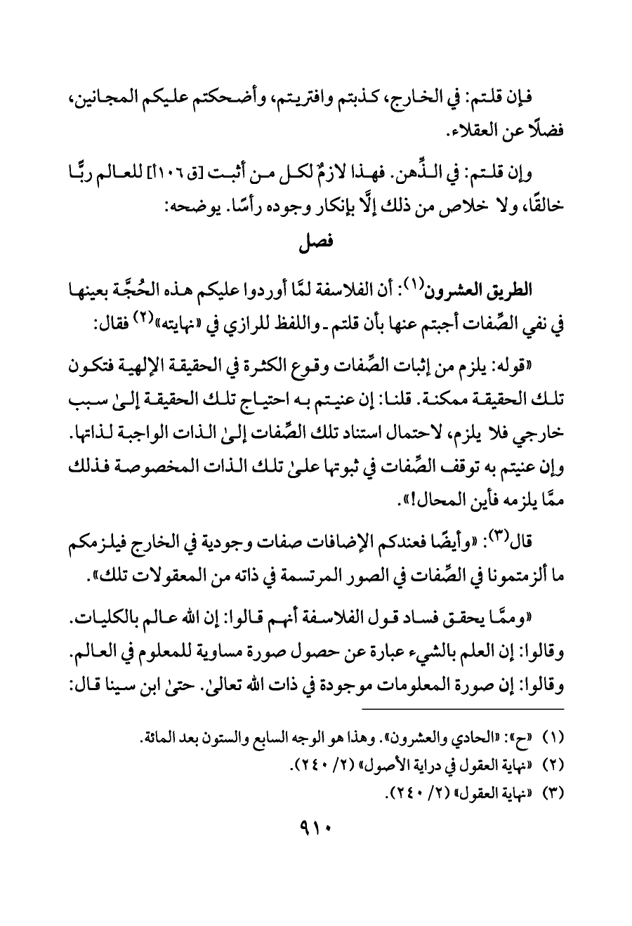 «وممَّا يحقق فساد قول الفلاسفة أنهم قالوا: إن الله عالم بالكليات. وقالوا: إن العلم بالشيء عبارة عن حصول صورة مساوية للمعلوم في العالم. وقالوا: إن صورة المعلومات موجودة في ذات الله تعالى. حتى ابن سينا قال: