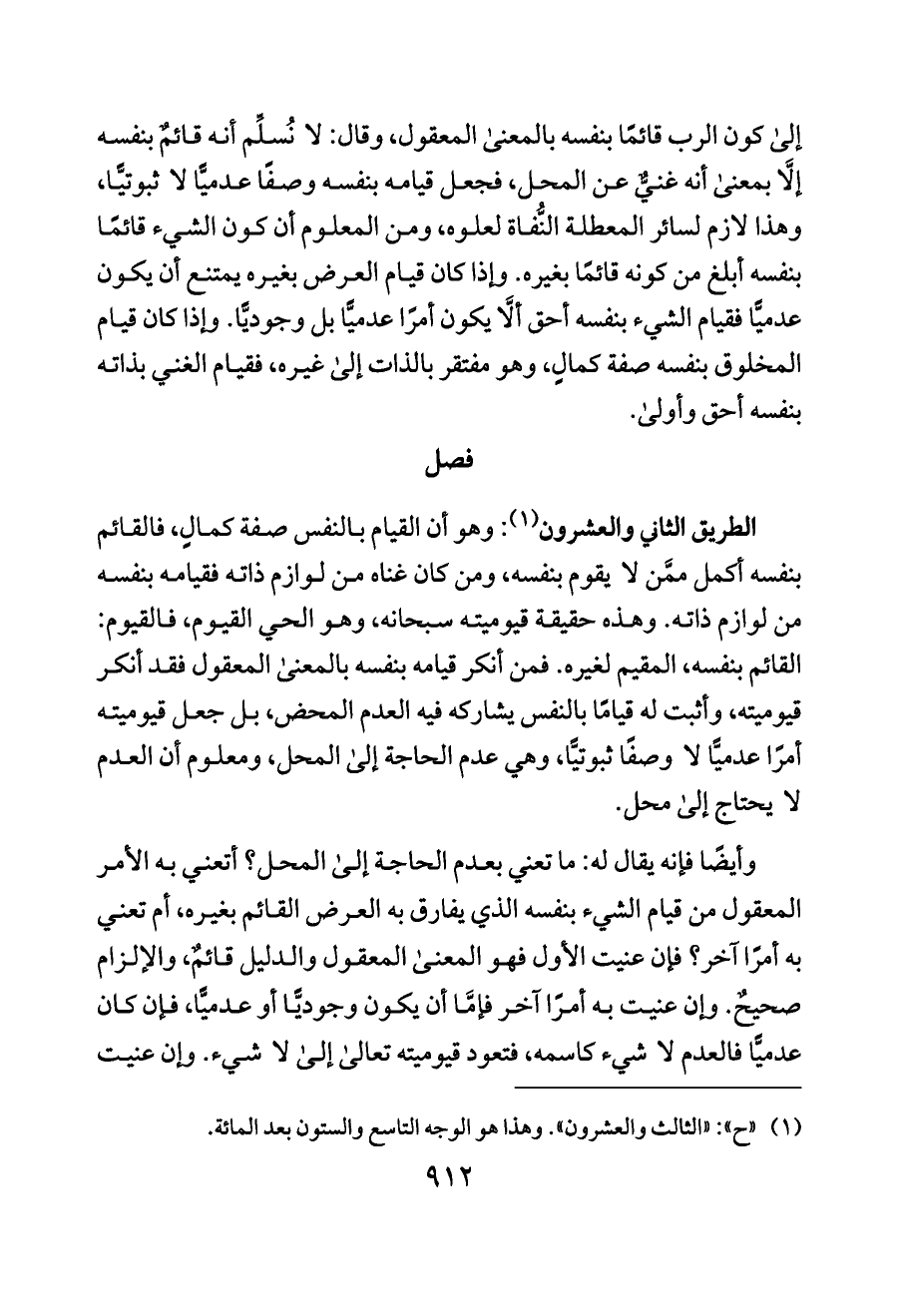 إلى كون الرب قائمًا بنفسه بالمعنى المعقول، وقال: لا نُسلِّم أنه قائمٌ بنفسه إلَّا بمعنى أنه غنيٌّ عن المحل، فجعل قيامه بنفسه وصفًا عدميًّا لا ثبوتيًّا، وهذا لازم لسائر المعطلة النُّفاة لعلوه، ومن المعلوم أن كون الشيء قائمًا بنفسه أبلغ من كونه قائمًا بغيره. وإذا كان قيام العرض بغيره يمتنع أن يكون عدميًّا فقيام الشيء بنفسه أحق ألَّا يكون أمرًا عدميًّا بل وجوديًّا. وإذا كان قيام المخلوق بنفسه صفة كمالٍ، وهو مفتقر بالذات إلى غيره، فقيام الغني بذاته بنفسه أحق وأولى.