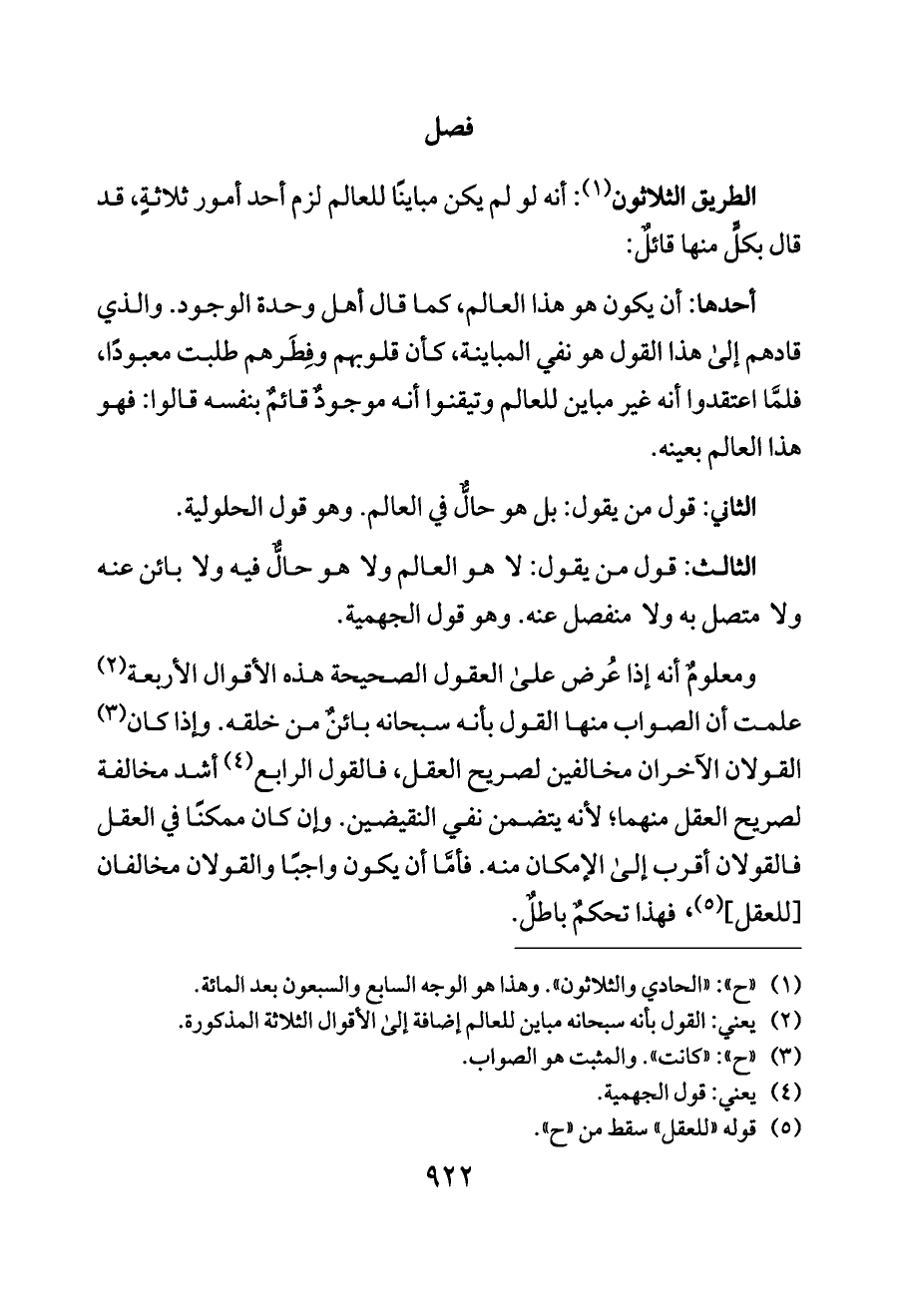 (¬٢) يعني: القول بأنه سبحانه مباين للعالم إضافة إلى الأقوال الثلاثة المذكورة.