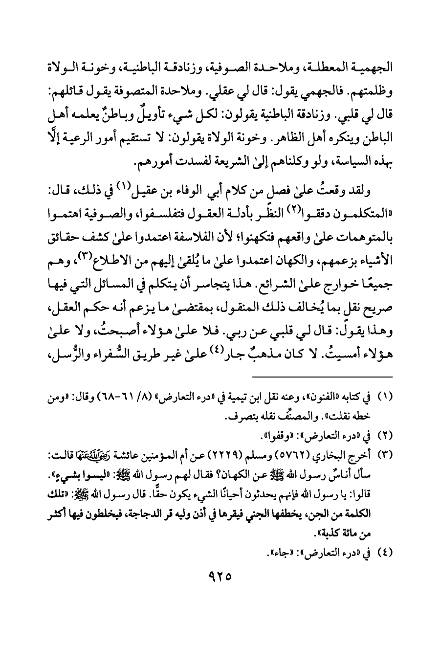 ولقد وقعتُ على فصلٍ من كلام أبي الوفاء بن عقيل (¬١) في ذلك، قال: «المتكلمون دققوا (¬٢) النظر بأدلة العقول فتفلسفوا، والصوفية اهتموا بالمتوهمات على واقعهم فتكهنوا؛ لأن الفلاسفة اعتمدوا على كشف حقائق الأشياء بزعمهم، والكهان اعتمدوا على ما يُلقى إليهم من الاطلاع (¬٣)، وهم جميعًا خوارج على الشرائع. هذا يتجاسر أن يتكلم في المسائل التي فيها صريح نقلٍ بما يُخالف ذلك المنقول، بمقتضى ما يزعم أنه حكم العقل، وهذا يقول: قال لي قلبي عن ربي. فلا على هؤلاء أصبحتُ، ولا على هؤلاء أمسيتُ. لا كان مذهبٌ جار (¬٤) على غير طريق السُّفراء والرُّسل،